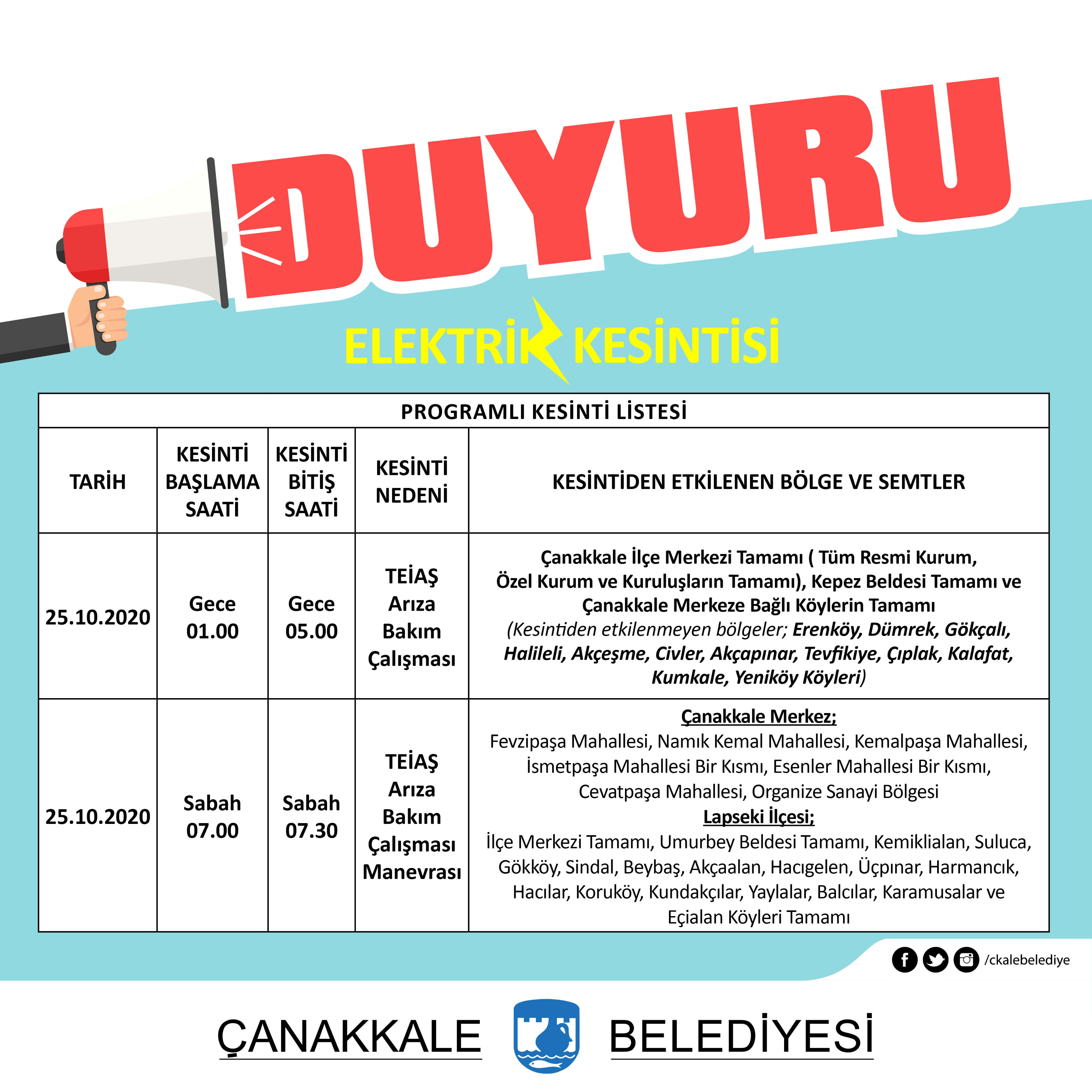 Türkiye Elektrik İletim A.Ş. (TEİAŞ) tarafından Çanakkale Trafo Merkezinde yapılacak olan arıza bakım çalışması kapsamında görselde belirtilen tarih ve belirtilen yerlerde elektrik kesintisi uygulanacaktır.
