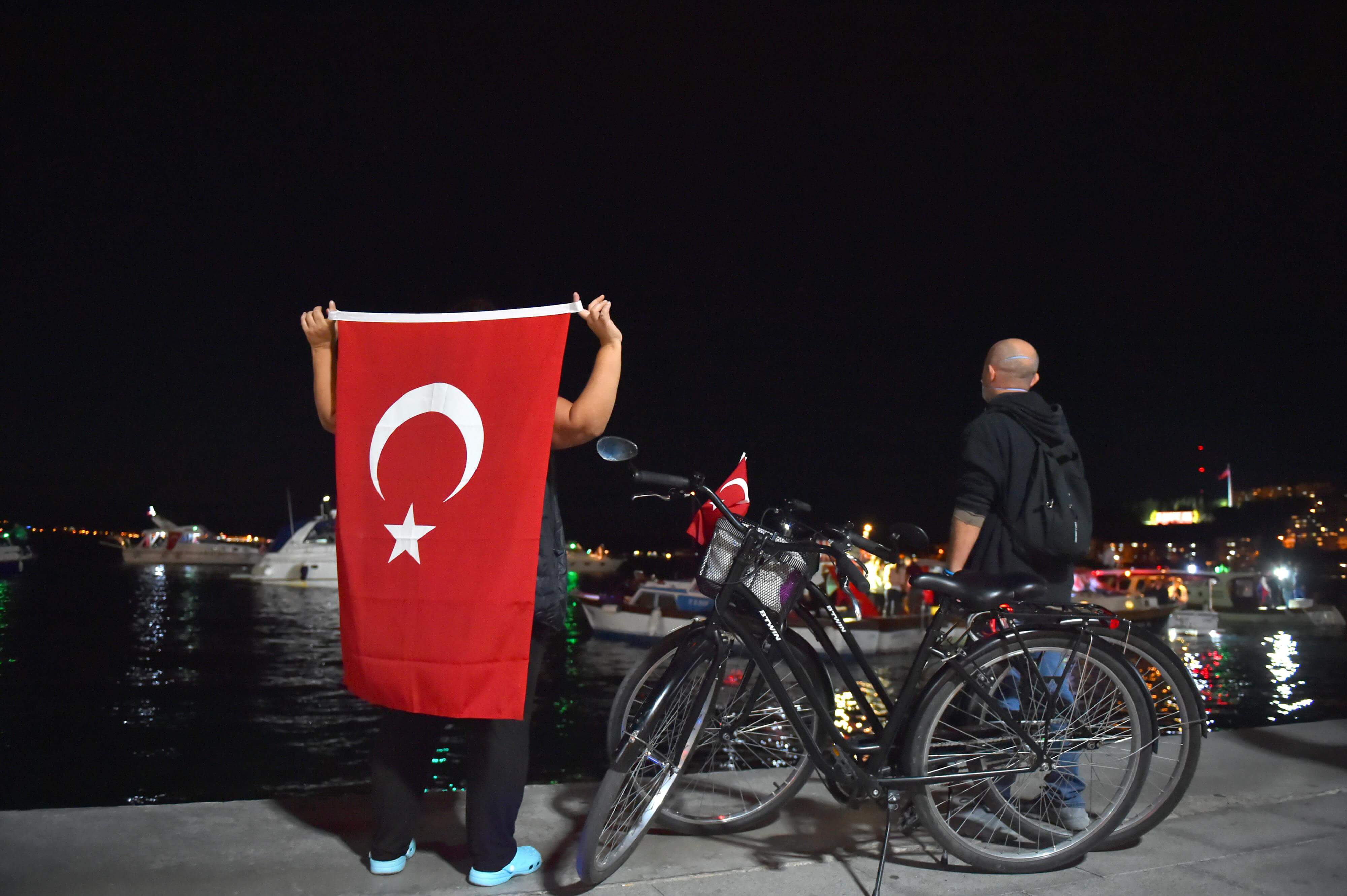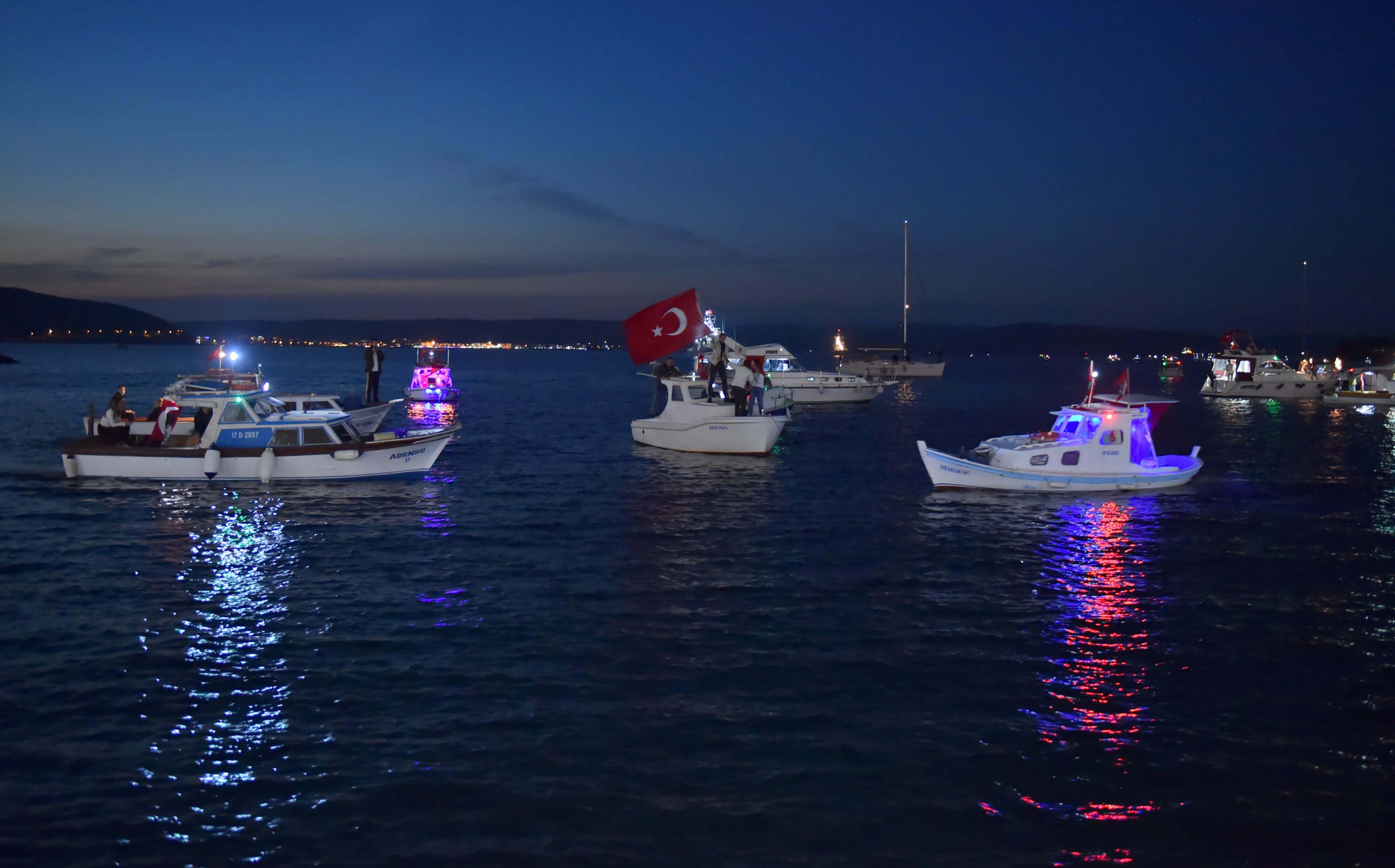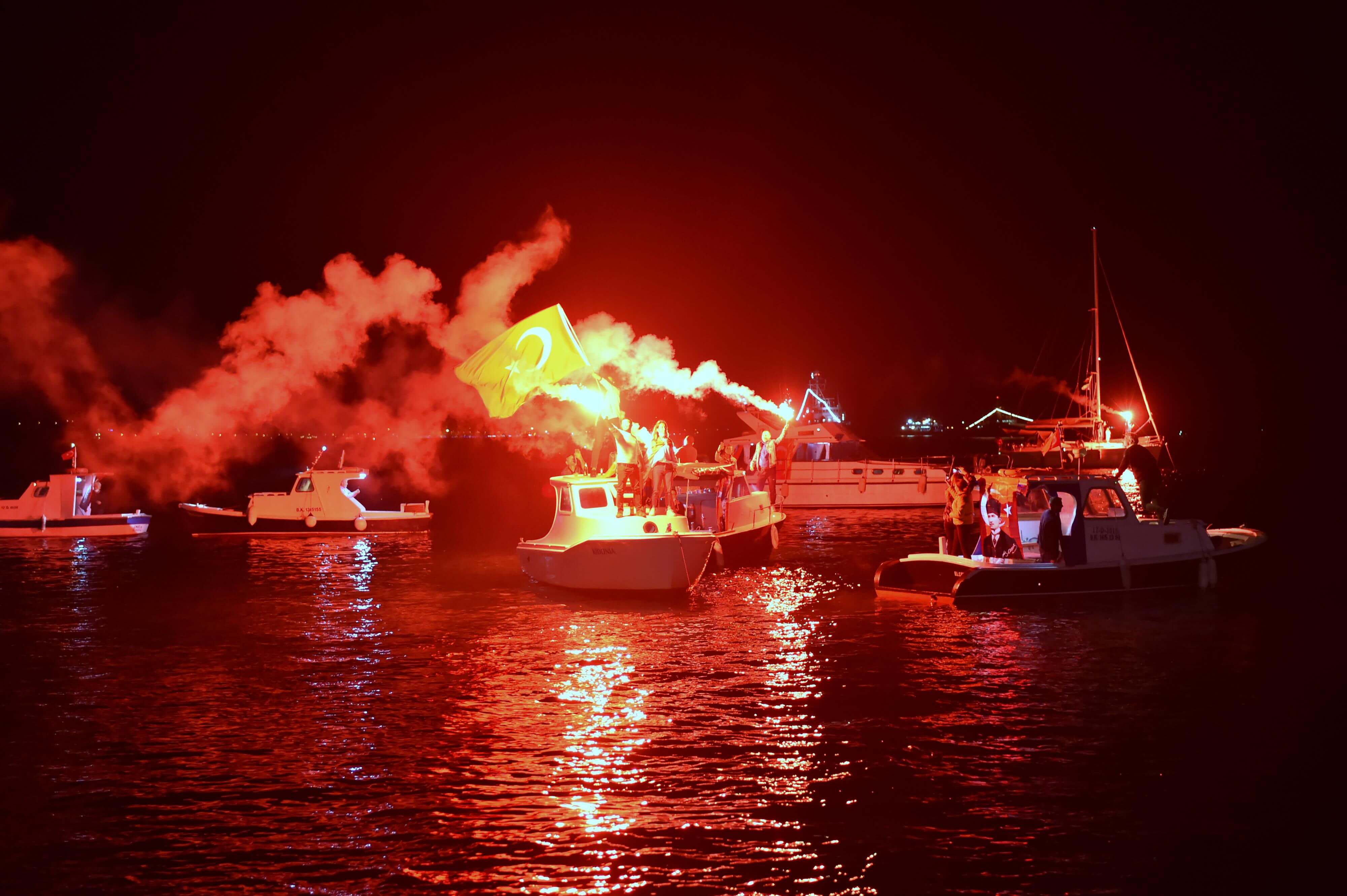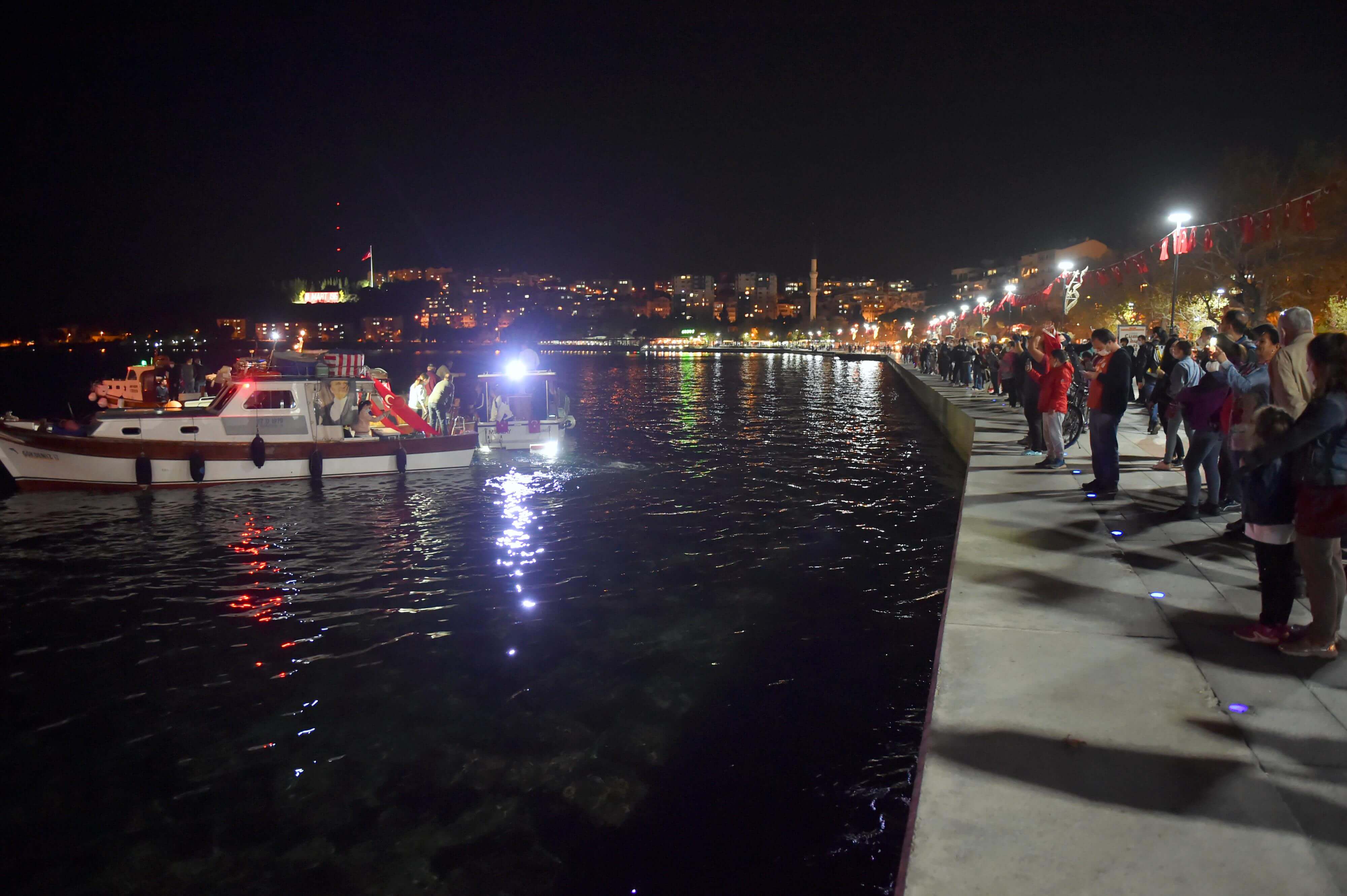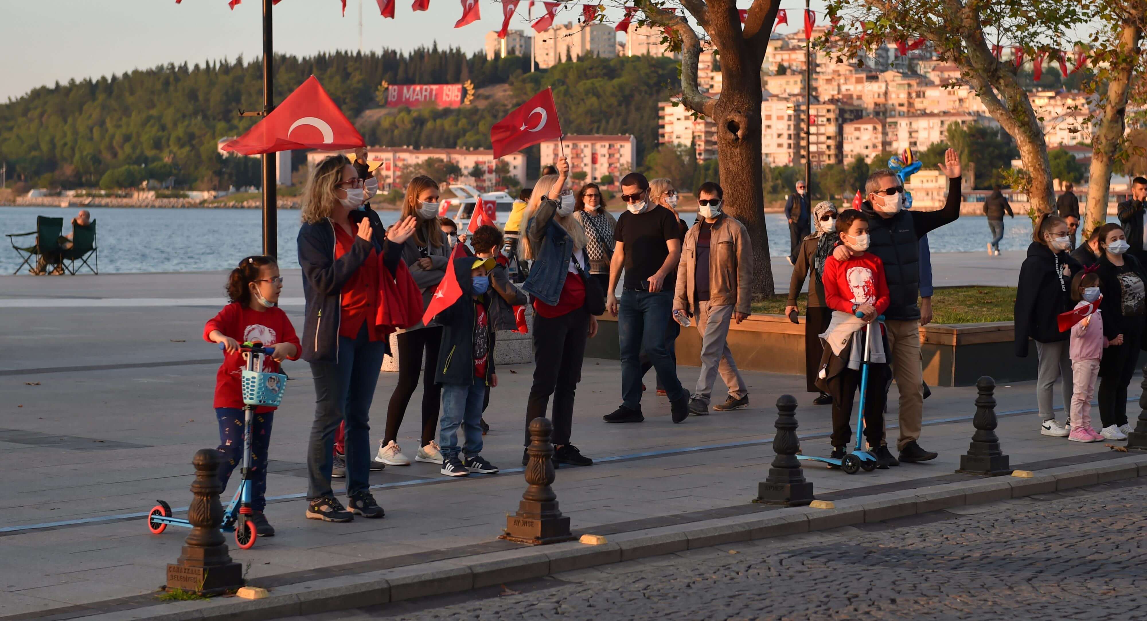 Kentte gün boyu süren etkinlikler, akşam saatlerinde de devam ederken, Kordonboyunda balıkçı teknelerinin gösterisi de büyük ilgi gördü. Tekneler, renkli meşalelerle boğazın sularını aydınlatırken, saatler 19.23'ü gösterdiğinde kordonboyundaki kentliler hep bir ağızdan İstiklal Marşı'nı seslendirdi. Bayram coşkusunun doyasıya yaşandığı bu anlarda ayrıca, yine Çanakkale Belediyesi tarafından gerçekleştirilen Tarihi Saat Kulesi'nin Türk Bayrağı formundaki aydınlatması da kentlilerden büyük beğeni topladı.