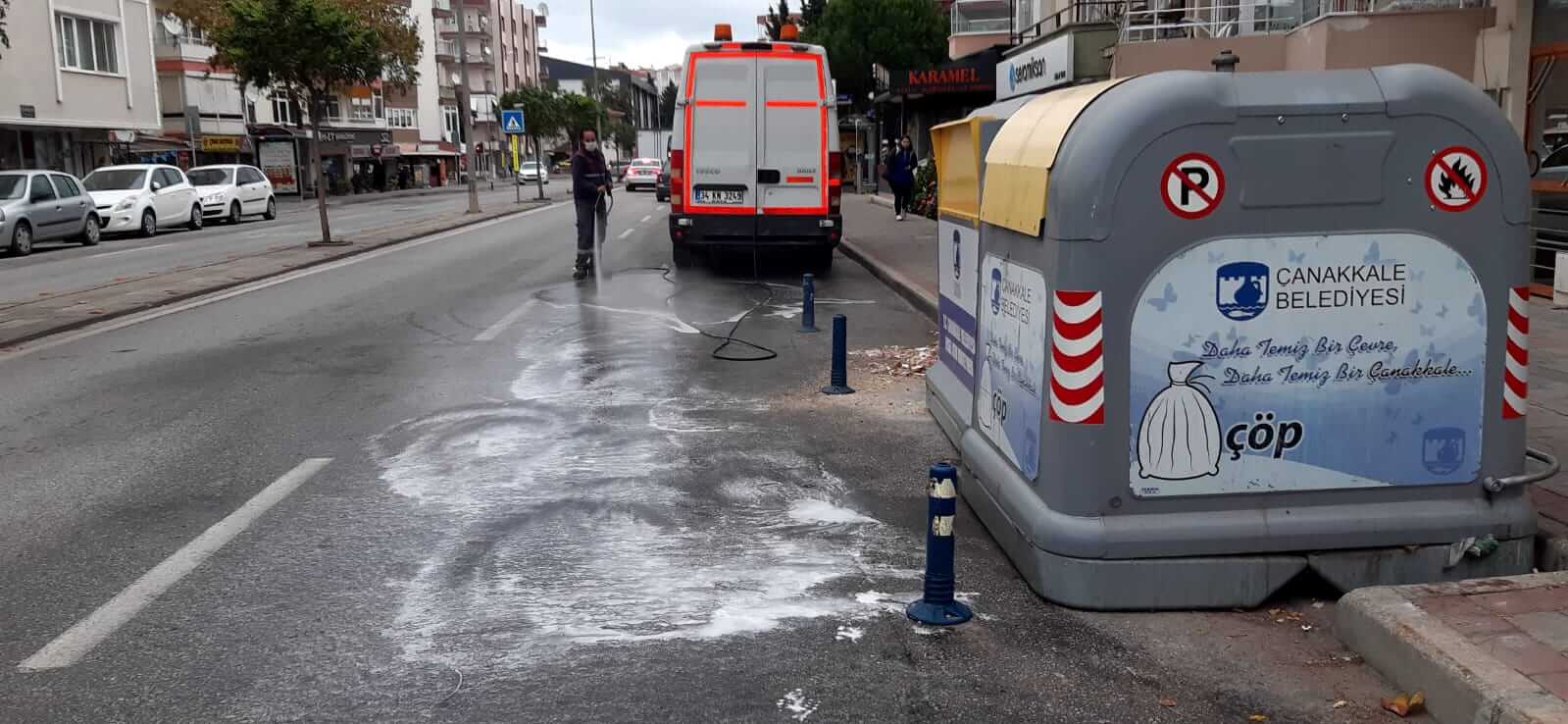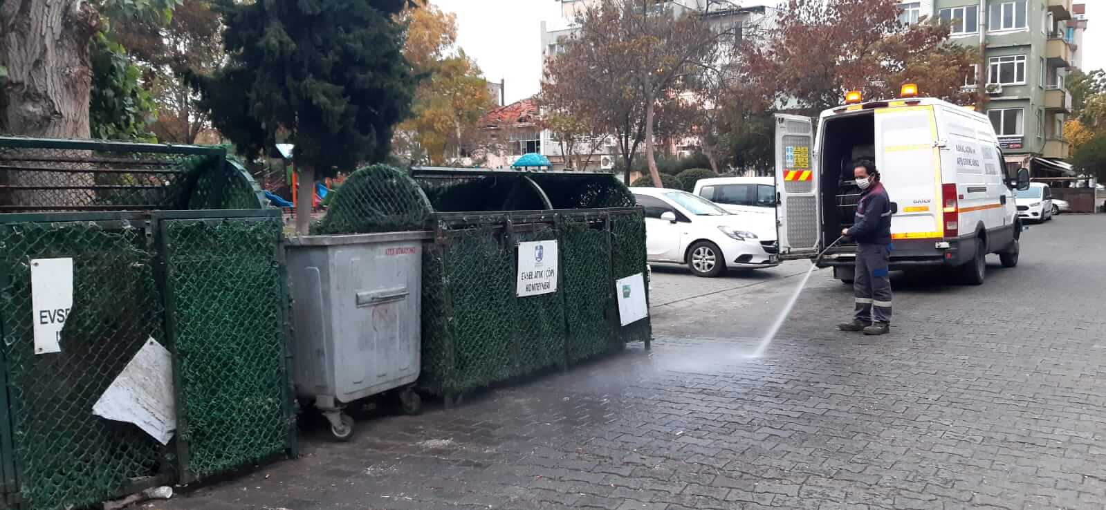 Kent genelinde tüm hızı ile devam eden çalışmalar kapsamında Temizlik İşleri Müdürlüğü ekipleri, kent genelinde tazyikli ve köpüklü sular ile çöp koyteynerleri ile çevrelerini temizleyerek dezenfekte etti.