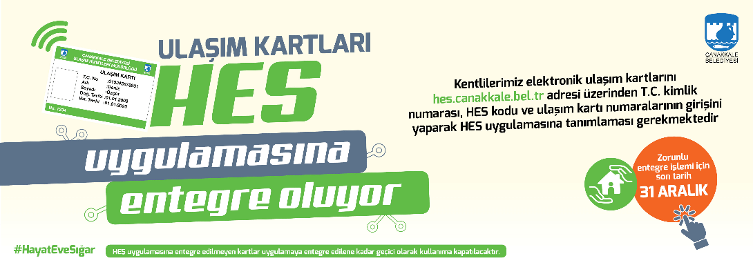 Bu kapsamda kentlilerimizin, elektronik ulaşım kartlarını hes.canakkale.bel.tr adresinden; T.C. kimlik numarası, HES kodu ve ulaşım kartı numaralarının girişini yaparak HES uygulamasına tanımlamaları gerekmektedir. Zorunlu entegre işlemi için son tarih 31 Aralık 2020’dir.