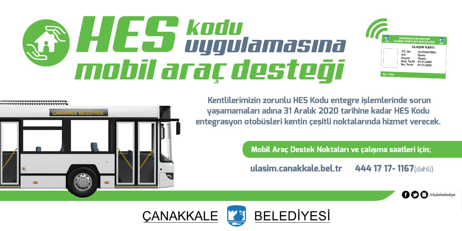 Öte yandan Çanakkale Belediyesi HES Kodu Entegrasyon Otobüsleri ile de kentliler ulaşım kartlarını uygulamaya entegre edebilecekler. 31 Aralık 2020 tarihine kadar; Pazartesi-Salı-Çarşamba-Perşembe günleri 10:00 ile 15:00 saatleri arasında; İskele Meydanı ve Özgürlük Parkı önünde, Cuma günleri ise 10:00 ile 15:00 saatleri arasında; Cuma Pazarı otoparkı yaya köprülerinin olduğu 3 noktada HES Kodu Entegrasyon Mobil Destek Otobüsleri kentlilere hizmet verecek.