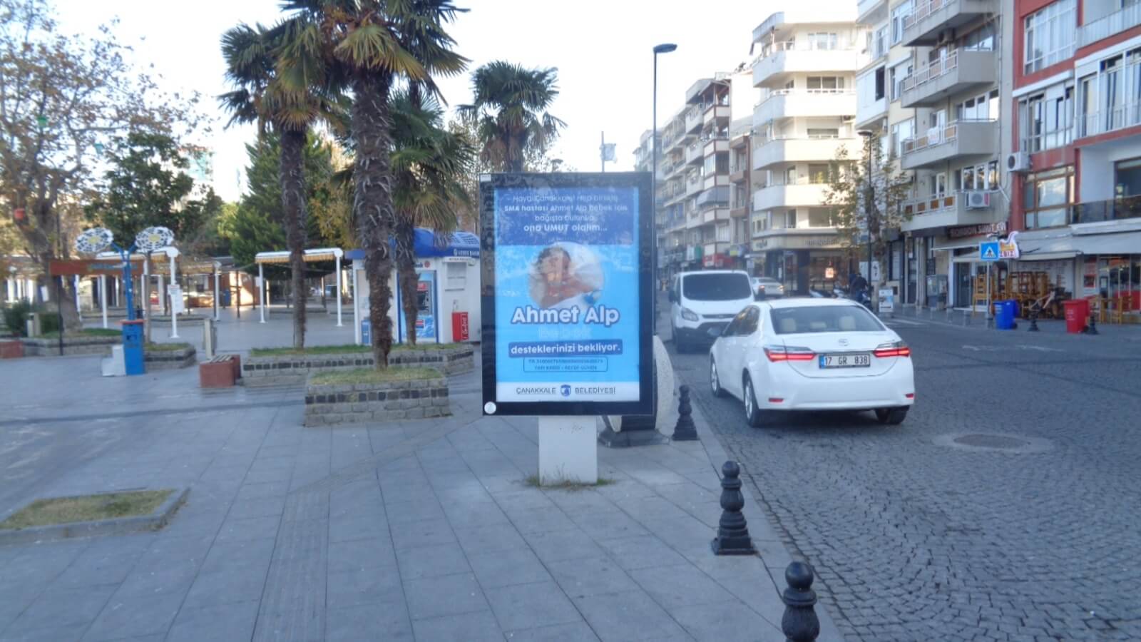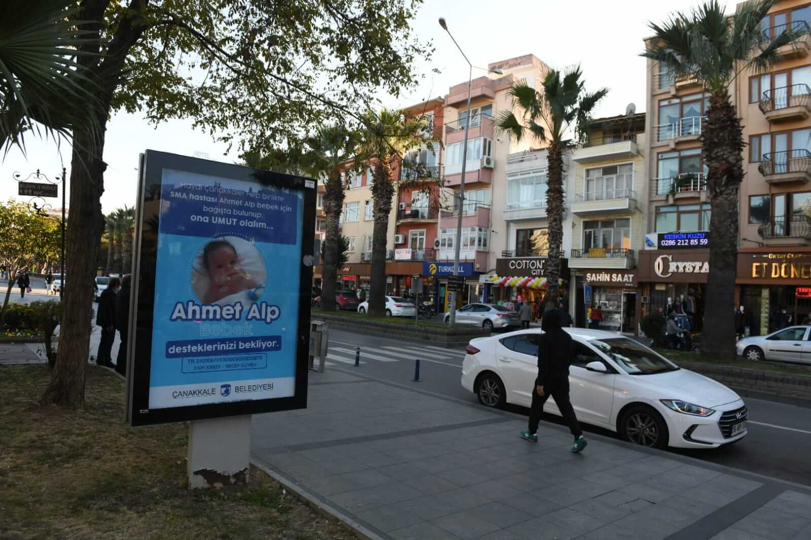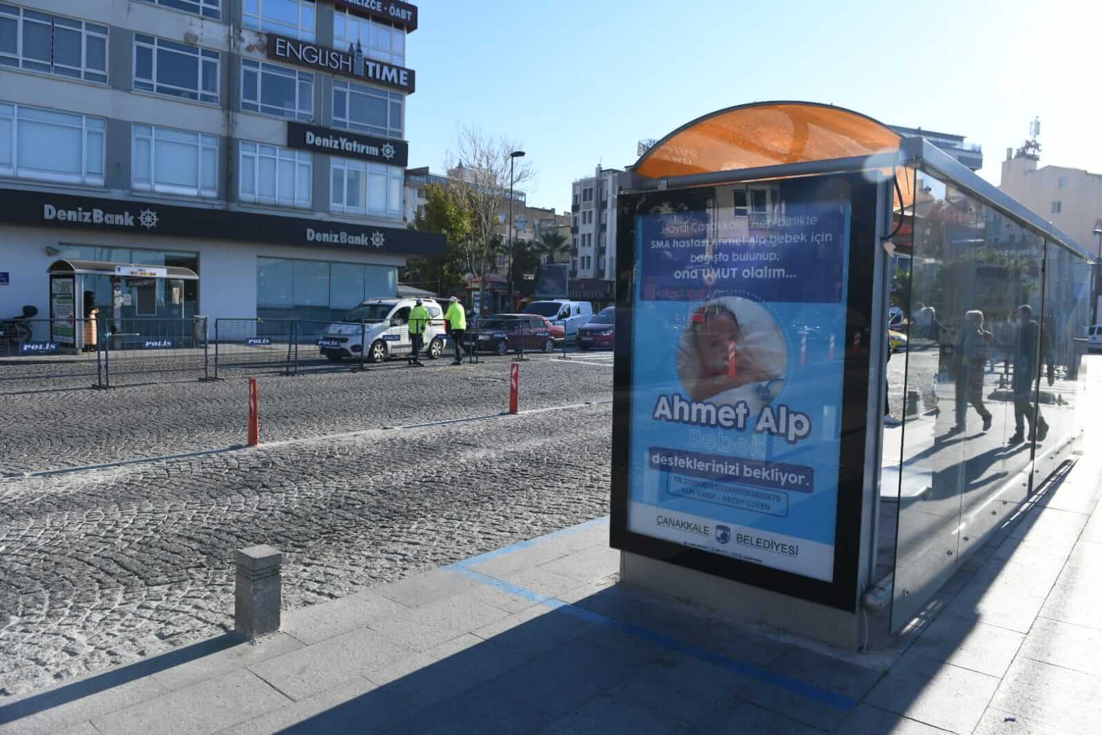 SMA Tip 1 Hastası Ahmet Alp bebeğin tedavi olabilmesi amacı ile oluşturulan kampanyaya destek veren Çanakkale Belediyesi, kentin çeşitli noktalarında raket ve billboardlara asılan afişler ile kentlileri Ahmet Alp'e umut olmaya çağırdı.