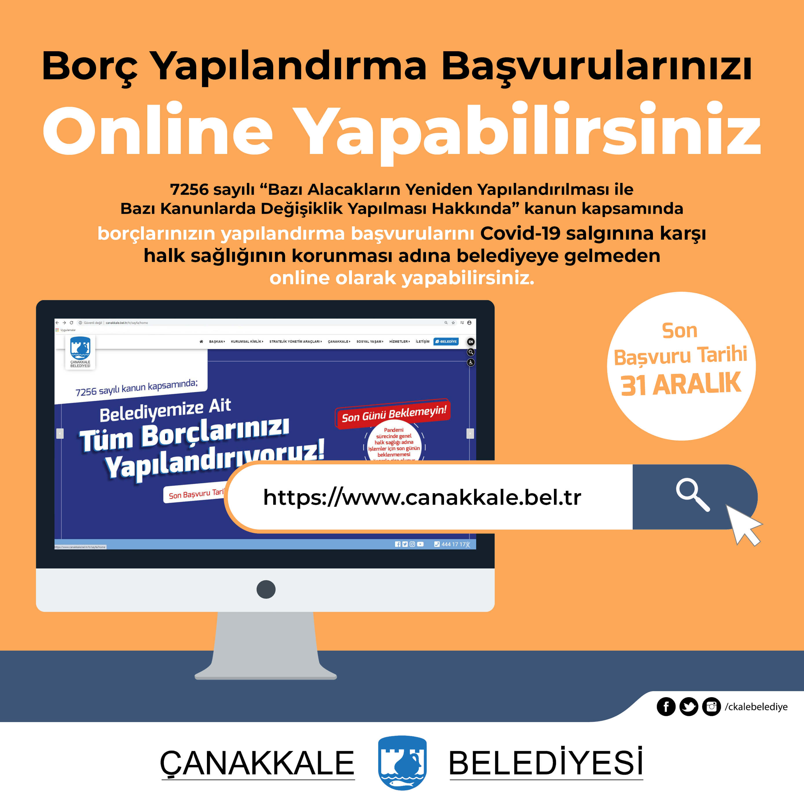 7256 sayılı “Bazı Alacakların Yeniden Yapılandırılması ile Bazı Kanunlarda Değişiklik Yapılması Hakkında” kanun kapsamında, borçlarınızın yapılandırma başvurularını Covid-19 salgınına karşı halk sağlığının korunması adına belediyeye gelmeden online olarak yapabilirsiniz.
