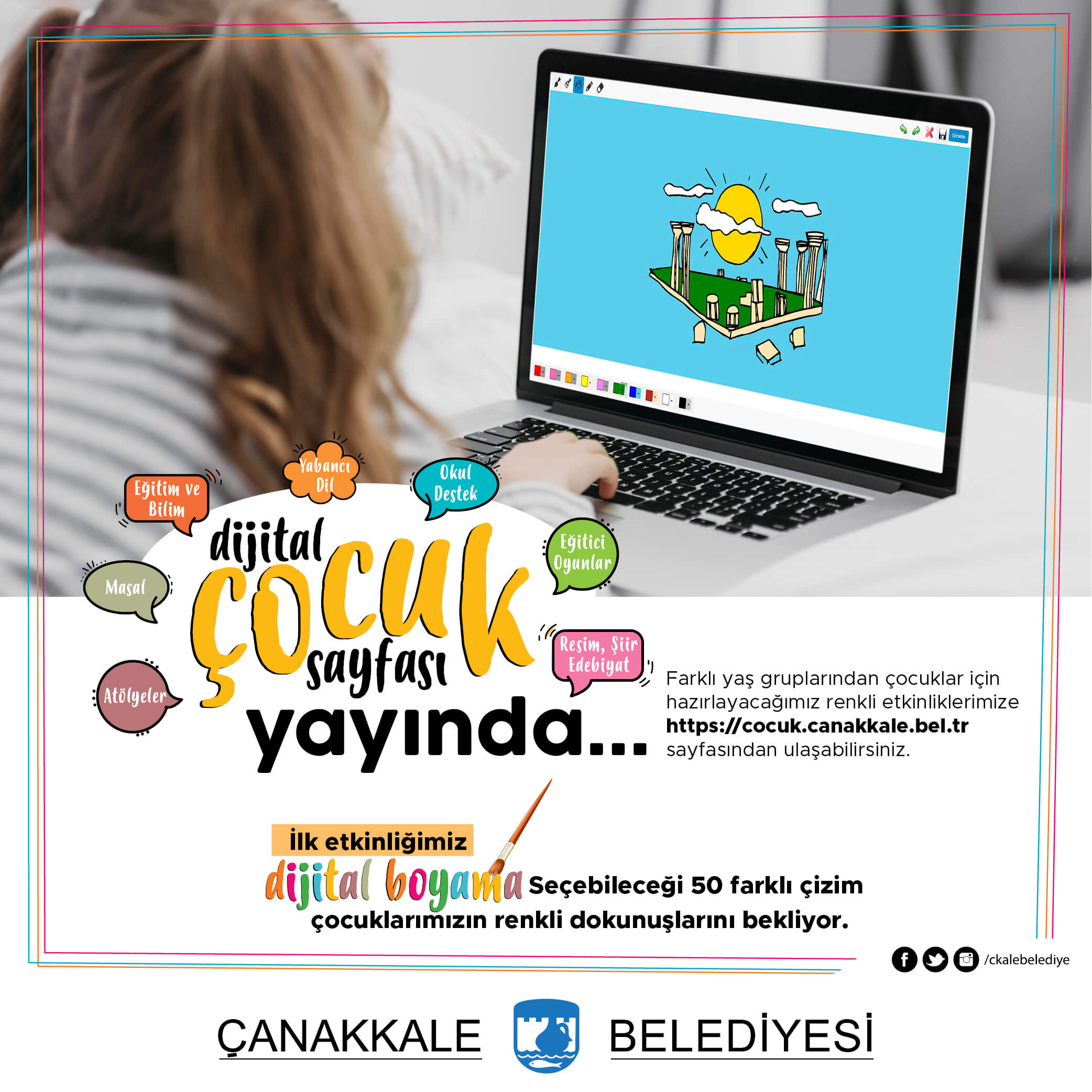 Pandemi sürecinde zamanın büyük çoğunluğunu evlerinde geçiren çocuklarımız için dijital ortamlarda pek çok etkinlik düzenleyen Çanakkale Belediyesi, son olarak yine kentli çocuklarımız için renkli ve eğlenceli faaliyetlerin yer alacağı Dijital Çocuk Sayfası’nı hazırladı. İlk etkinliğin “dijital boyama” olduğu sayfa, kentli çocukları bekliyor.