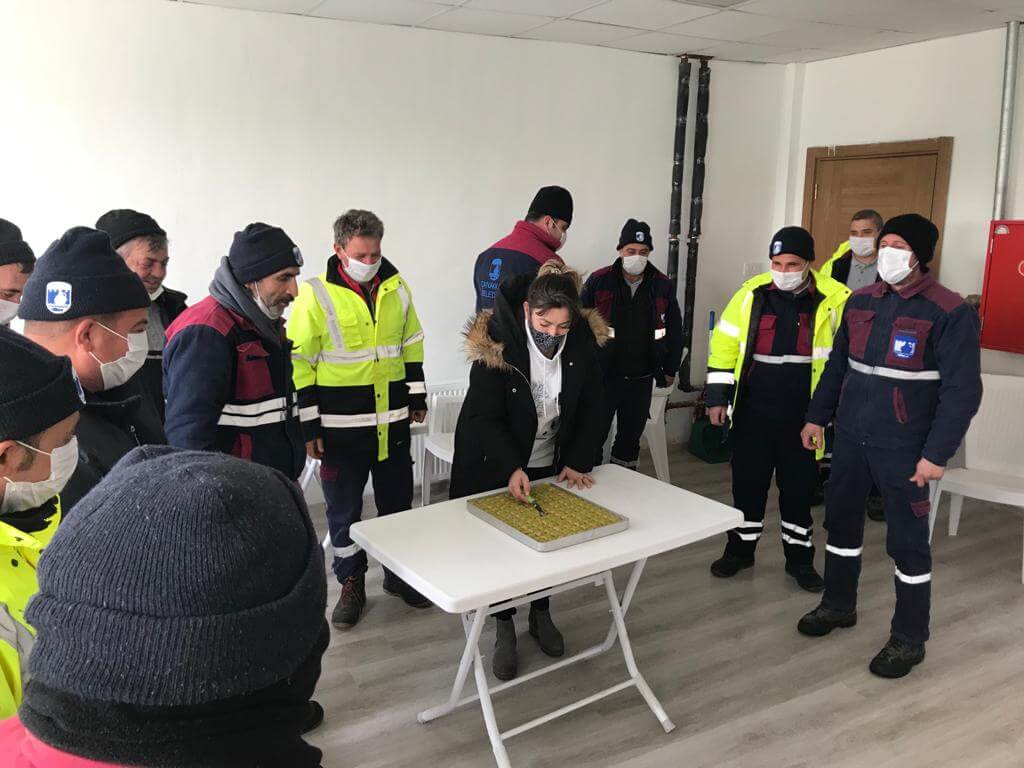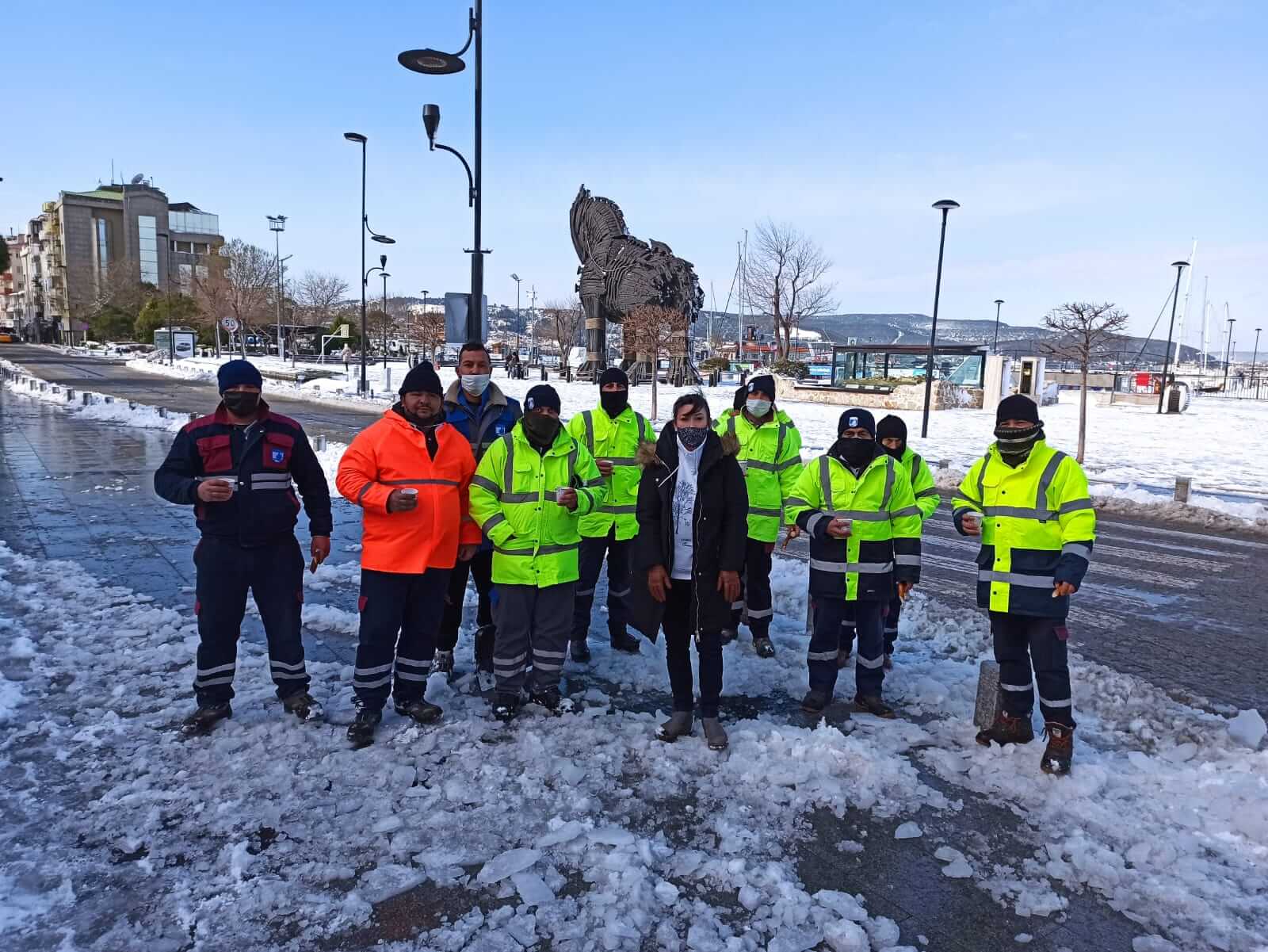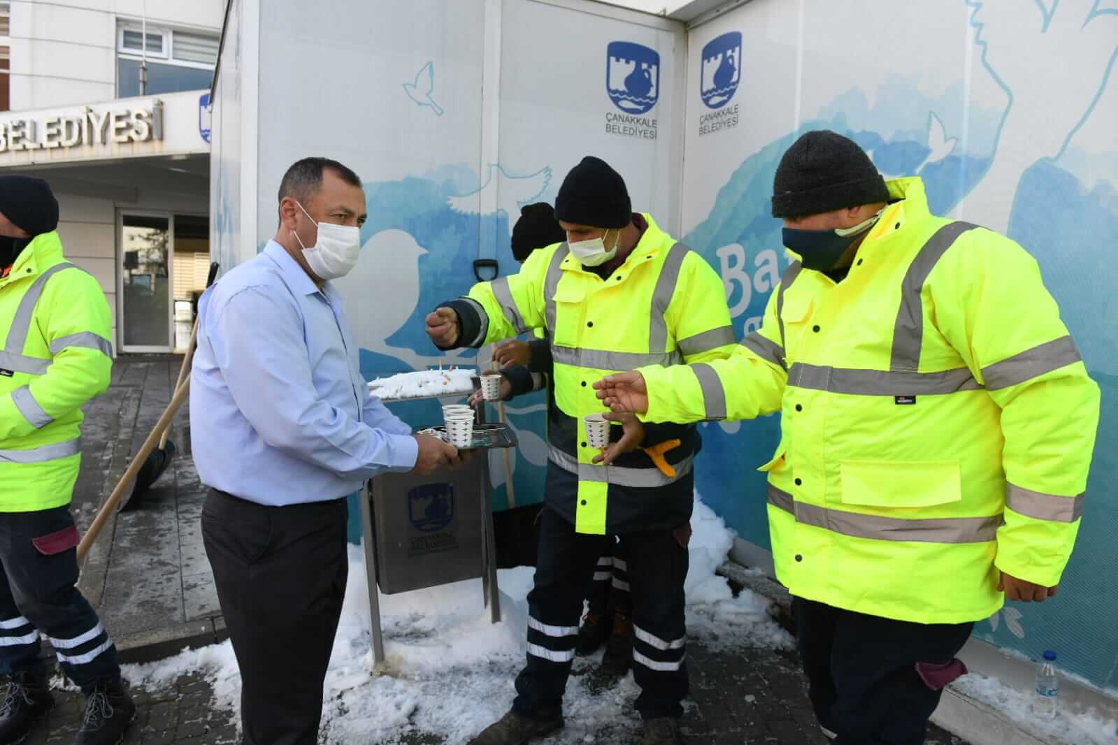 Kentte etkisini gösteren kar yağışının başlamasından itibaren büyük bir özveri ile çalışmalarını sürdüren belediye personeline teşekkür eden Belediye Başkanı Ülgür Gökhan da personele baklava ikramında bulundu. Öte yandan, kaldırımlarda buzlanma nedeni ile istenmeyen kazaların önüne geçmek ve kentlilerimizin daha rahat yürüyebilmesi için kar küreme çalışması gerçekleştiren ekiplere de çay ve simit ikramında bulunuldu.