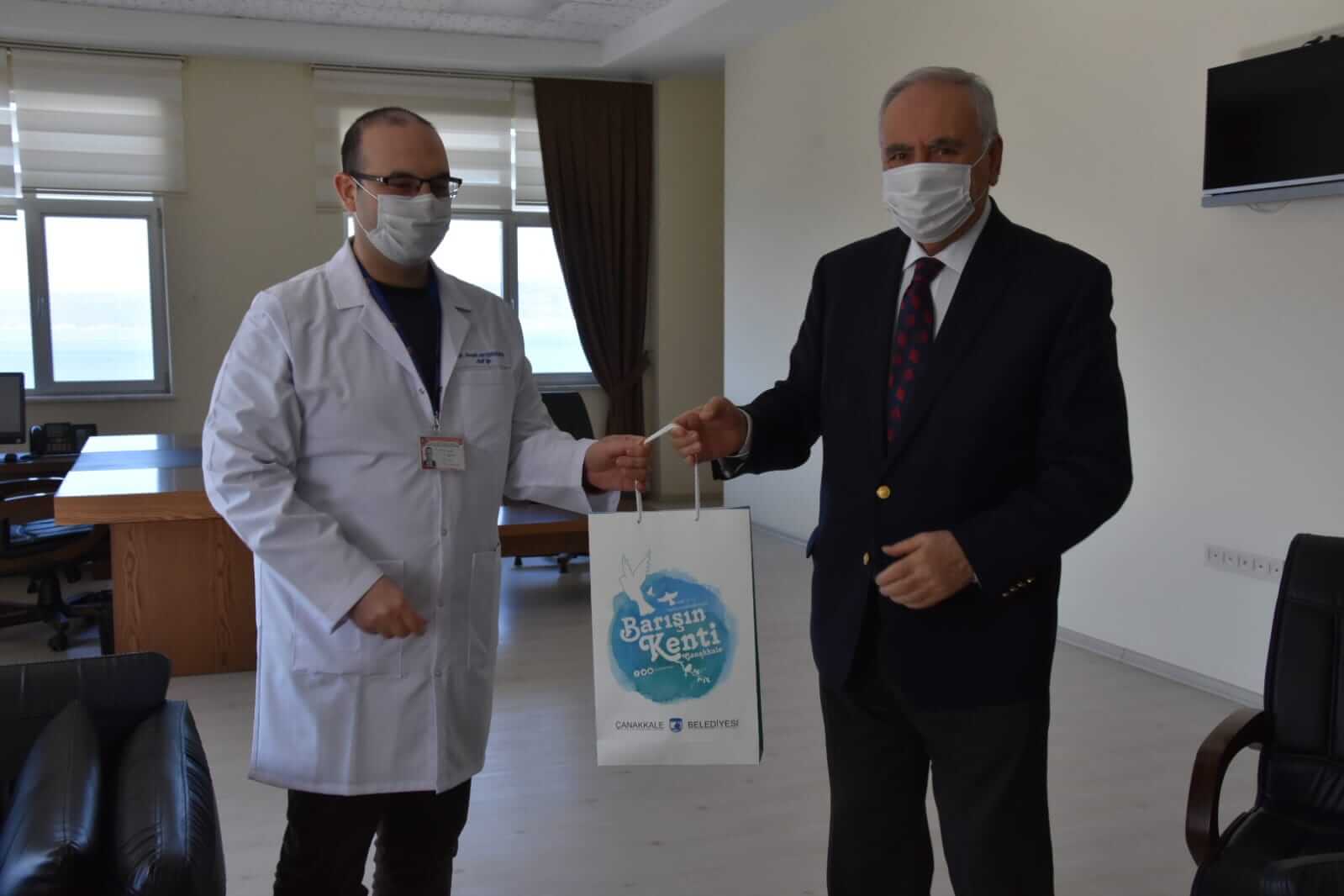 Başkan Gökhan, bir yıla yaklaşan bir süre zarfında halk sağlığı adına büyük bir çaba ortaya koyan ve değerine paha biçilemez bir emek veren sağlık çalışanlarına hem kendi adına hem Çanakkale Belediyesi adına teşekkürlerini iletti. Başkan Gökhan, bu kapsamda özel olarak hazırlanan; Troiada Kadın Girişimi Üretim ve İşletme Kooperatifinin kadınları tarafından üretilen doğal tarhana ile Çanakkale Seramik Atölyesi ustalarının elinden çıkan seramik çorba kaselerini yönetime takdim etti.