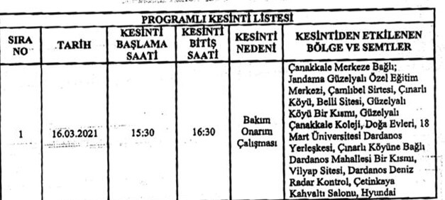 Uludağ Elektrik Dağıtım A.Ş. Çanakkale İşletme Bakım Mühendisliğinden yapılan açıklamaya göre;