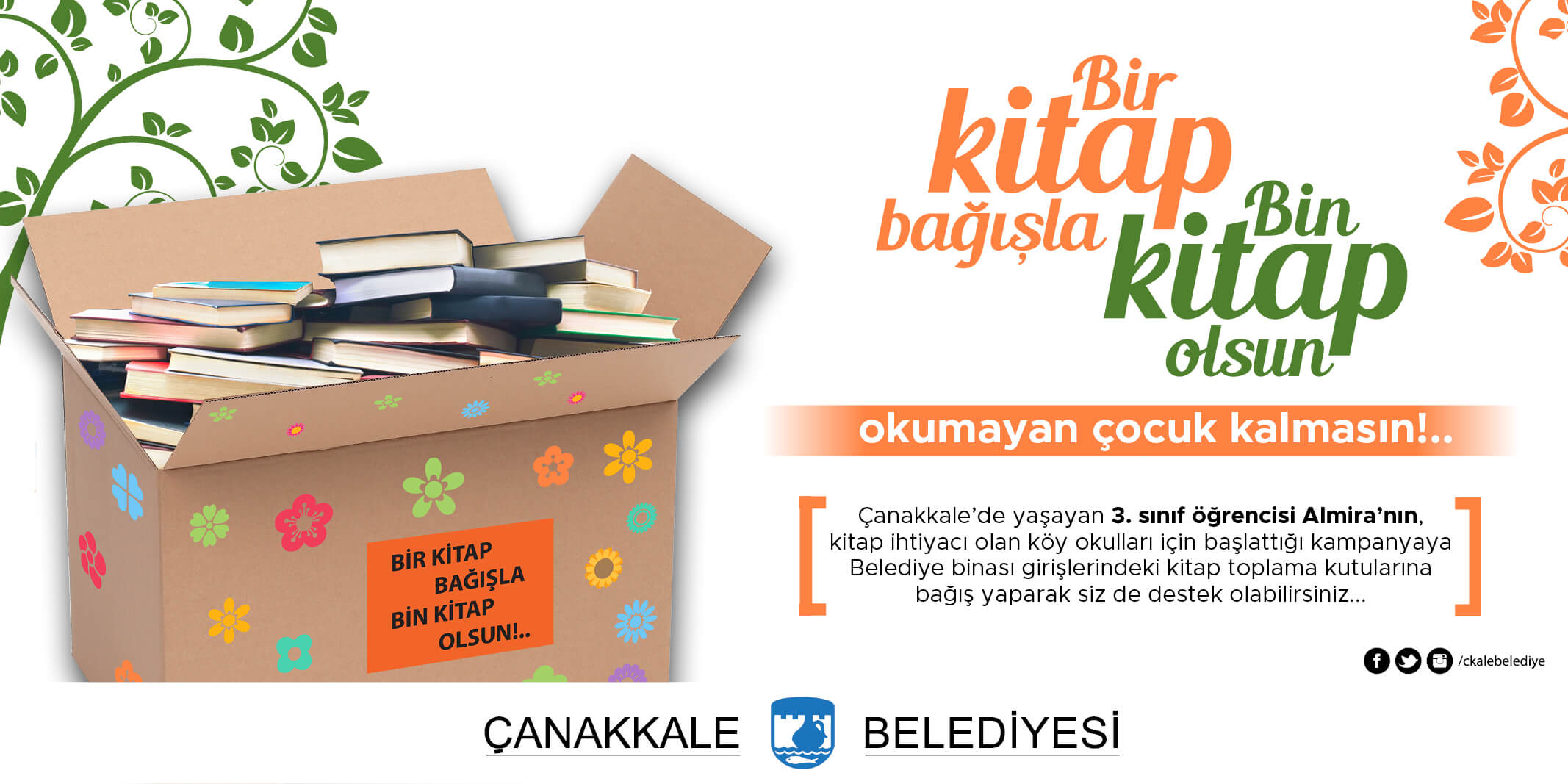Çanakkale'de yaşayan 3. Sınıf öğrencisi Almira'nın kitap ihtiyacı olan köy okulları için başlattığı kampanyaya, Belediye hizmet binamızın girişindeki kitap toplama kutularına bağış yaparak siz de destek olabilirsiniz.