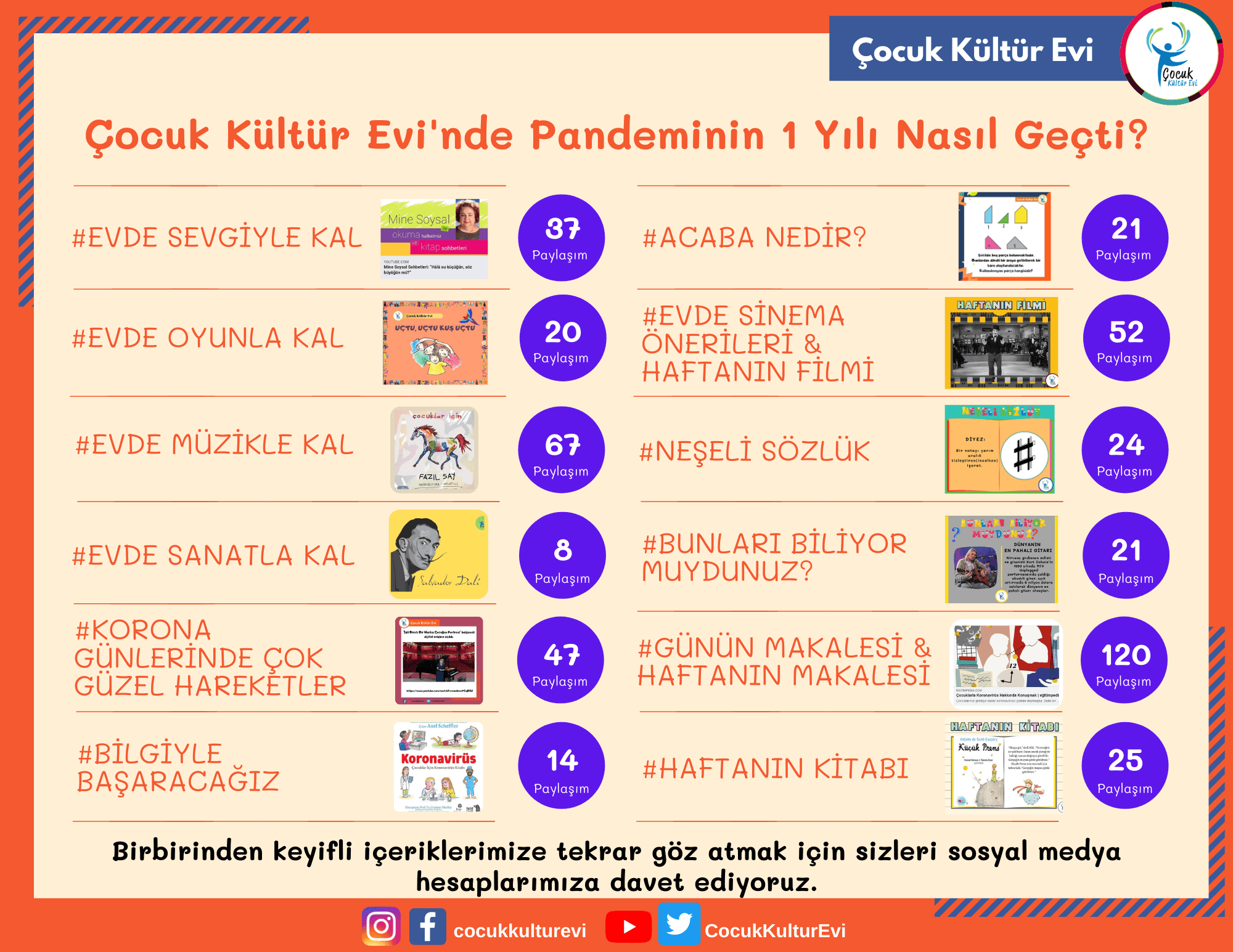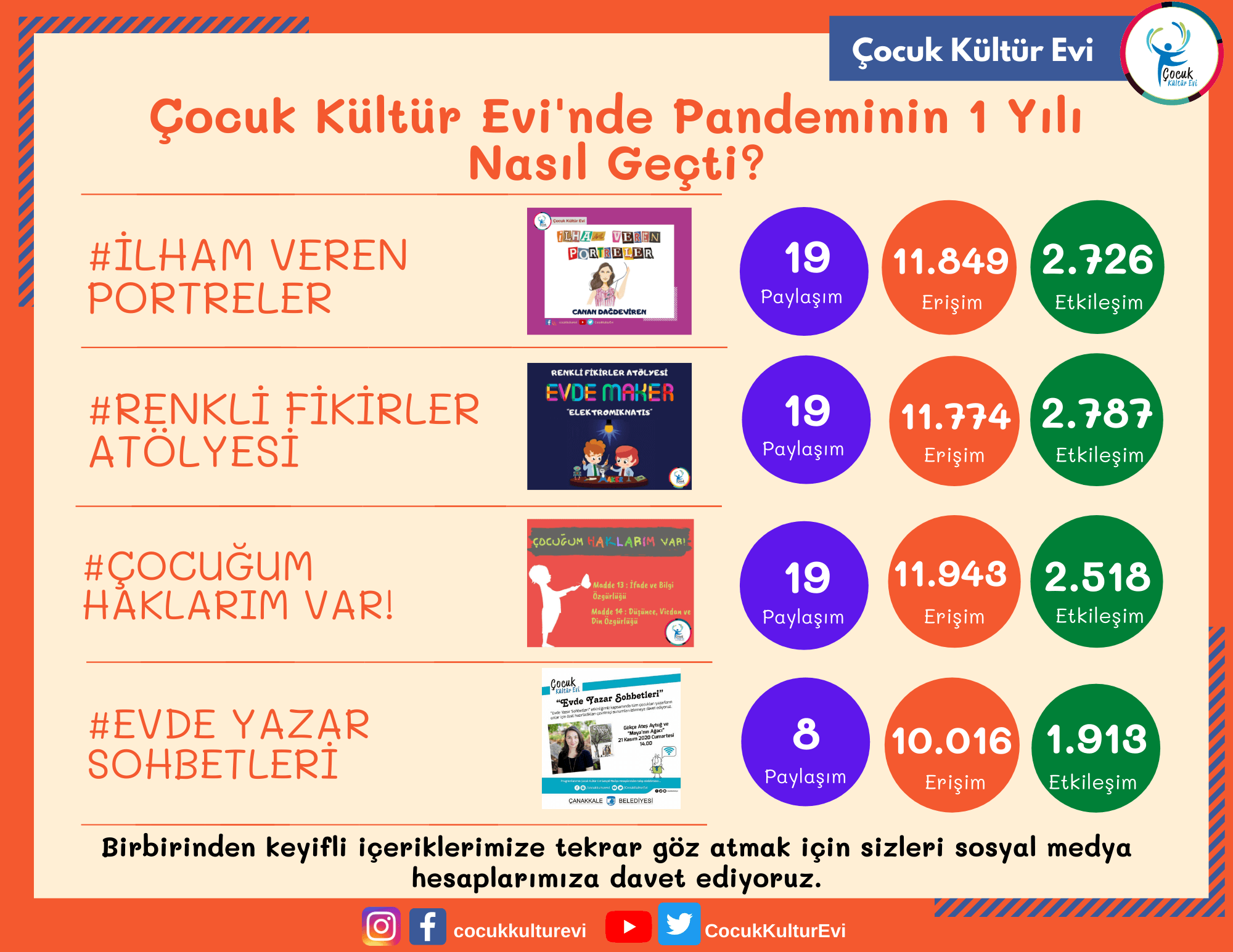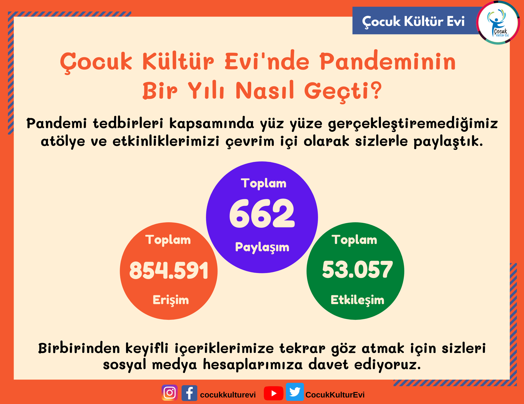 Salgının ve salgın önlemleri kapsamında büyük ölçüde zorunlu hale gelen sosyal izolasyonun çocuklar ve aileler üzerindeki olası olumsuz etkilerinin azaltılmasına katkı sunmak amacıyla başta üyeleri olmak üzere, hedef kitlesinde olan tüm 5-15 yaş aralığındaki çocuklara ve ebeveynlerine yönelik olarak Çocuk Kültür Evi eğitmenlerince hazırlanan çevrim içi paylaşım programı, bir yılda 662 içerikle toplam 53.057 etkileşim ve 854.591 erişime ulaştı.