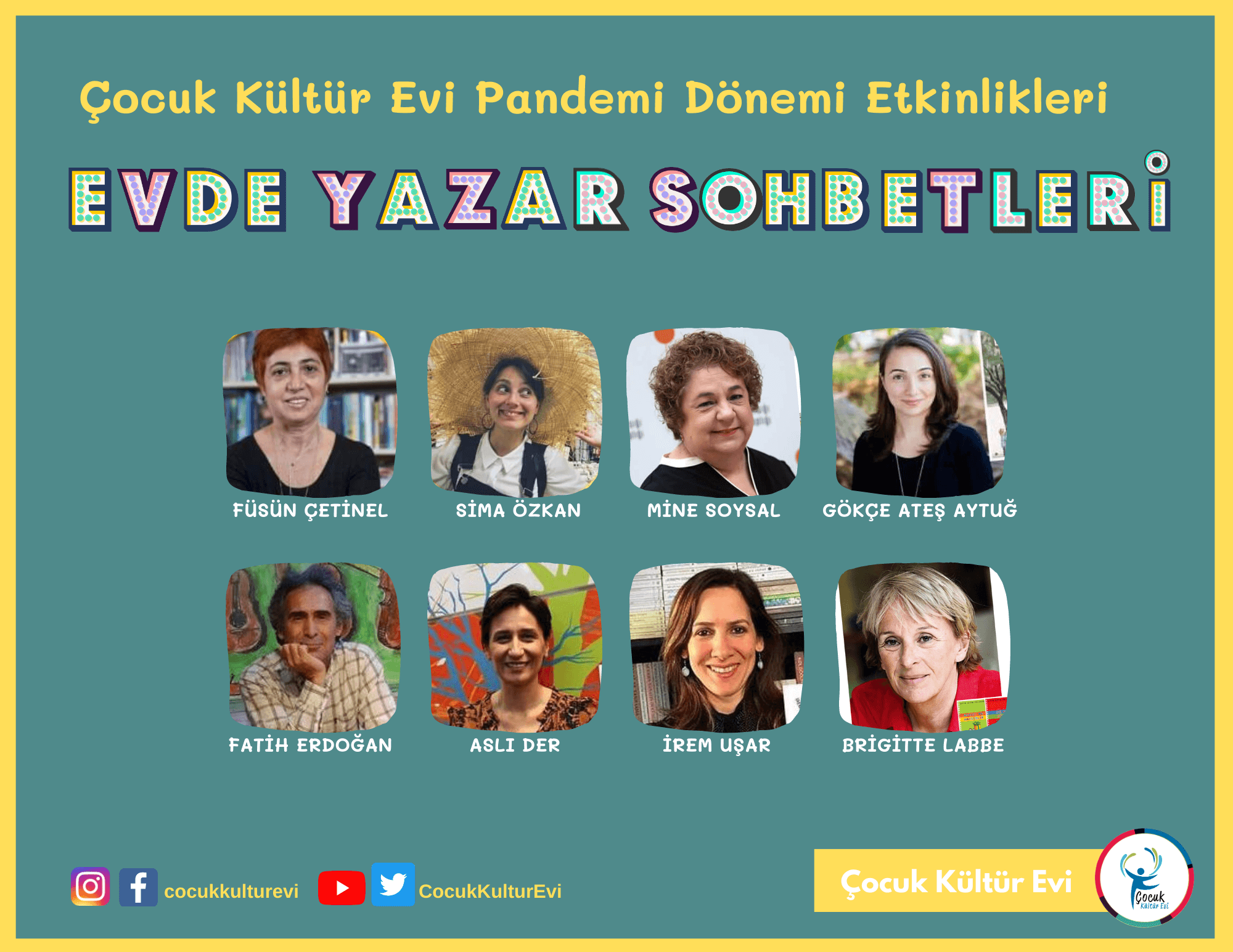 Çocuk Kültür Evi, çevrim içi paylaşım programı kapsamında yürüttüğü “Evde Yazar Sohbetleri” etkinliği ile çocukları Mine Soysal’dan Fatih Erdoğan’a, Brigitte Labbe’den Füsun Çetinel’e çocuk edebiyatının sevilen yazarlarıyla bir araya getirdi. Programın merakla takip edilen başlığı “İlham Veren Portreler” ile Beethoven'den Einstein'a, Türkan Saylan'dan Fazıl Say'a tüm dünyaya ilham veren isimlerin hayatlarını daha yakından tanıma fırsatı sunuldu. “Renkli Fikirler Atölyesi” başlığı ile sunulan ve evde geçirilen vakti daha keyifli hale getirmeyi amaçlayan çevrim içi atölyeler aracılığıyla da kolay bulunabilir malzemelerle bilimden oyun atölyelerine, makerdan ileri dönüşüme kadar birbirinden eğlenceli öneriler paylaşıldı.