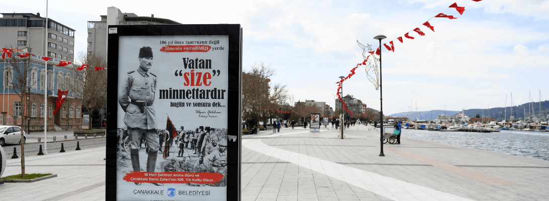 Çanakkale Belediyesinin her 18 Mart'ta olduğu gibi bu sene de gerçekleştirdiği çalışmalar kapsamında, kentin pek çok noktası Atatürk posterleri ve Türk bayrakları ile donatılırken, Çanakkale Belediyesinin günün anlam ve önemine ilişkin görsel tasarımları da kentin çeşitli noktalarındaki yerlerini aldı.