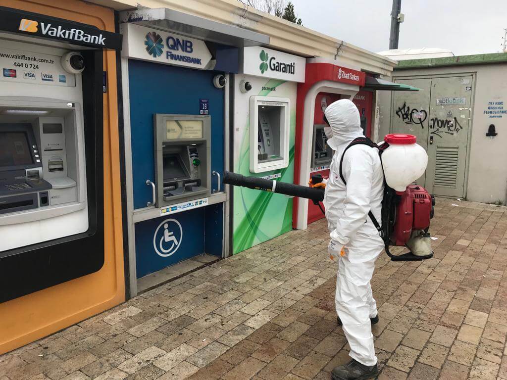 Belediye birimlerinin yanı sıra kentliler tarafından yoğun olarak kullanılan banka ATM’leri de belediye ekiplerince düzenli olarak dezenfekte ediliyor.