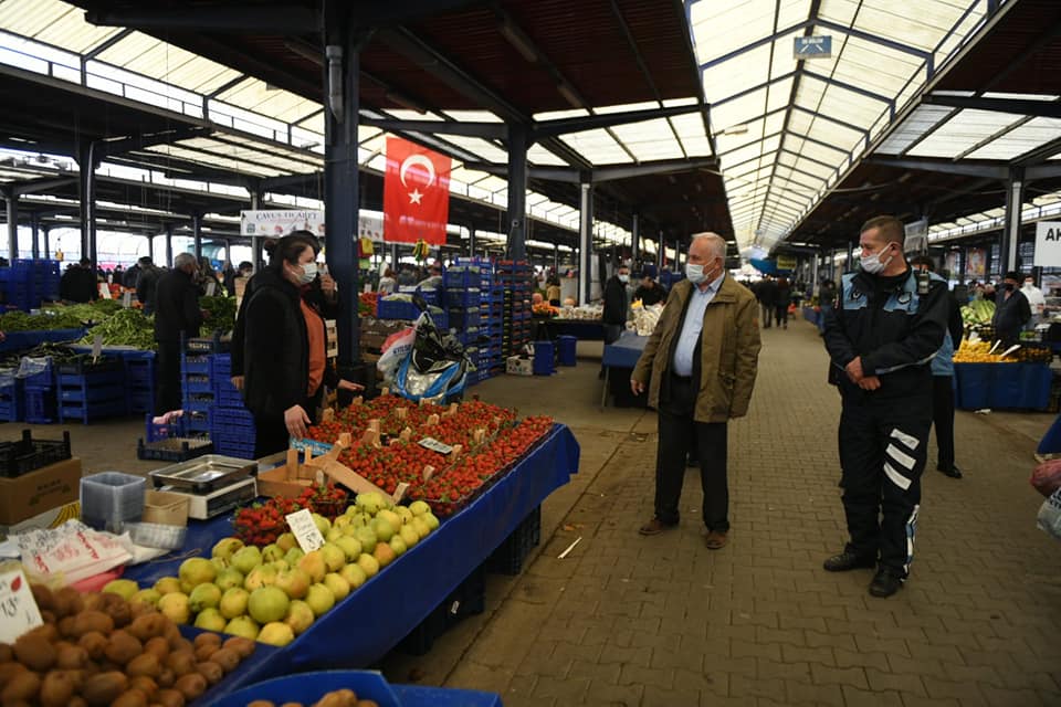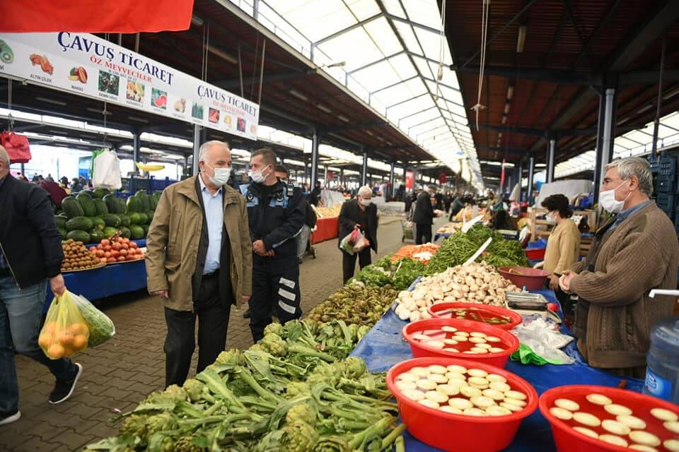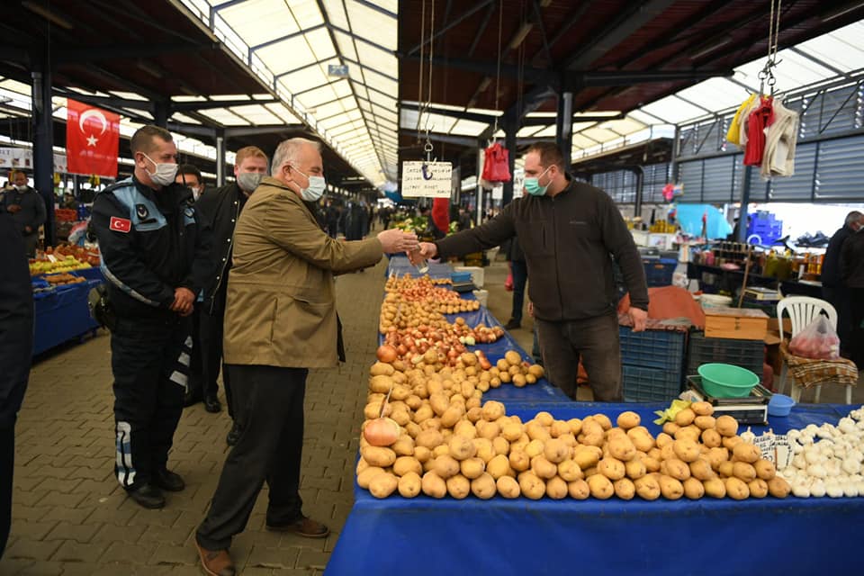 Zabıta ekipleri eşliğinde pazar alanını gezen Başkan Gökhan, Covid-19 salgını ile mücadele kapsamında İl Umumi Hıfzıssıhha Kurulunca alınan kararlar doğrultusunda uygulanan tedbirleri denetledi. Başkan Gökhan, zabıta ekiplerinden kentlilerin daha sağlıklı koşullarda pazar alışverişi yapabilmeleri amacı ile alınan önlemlere ilişkin de bilgi aldı.