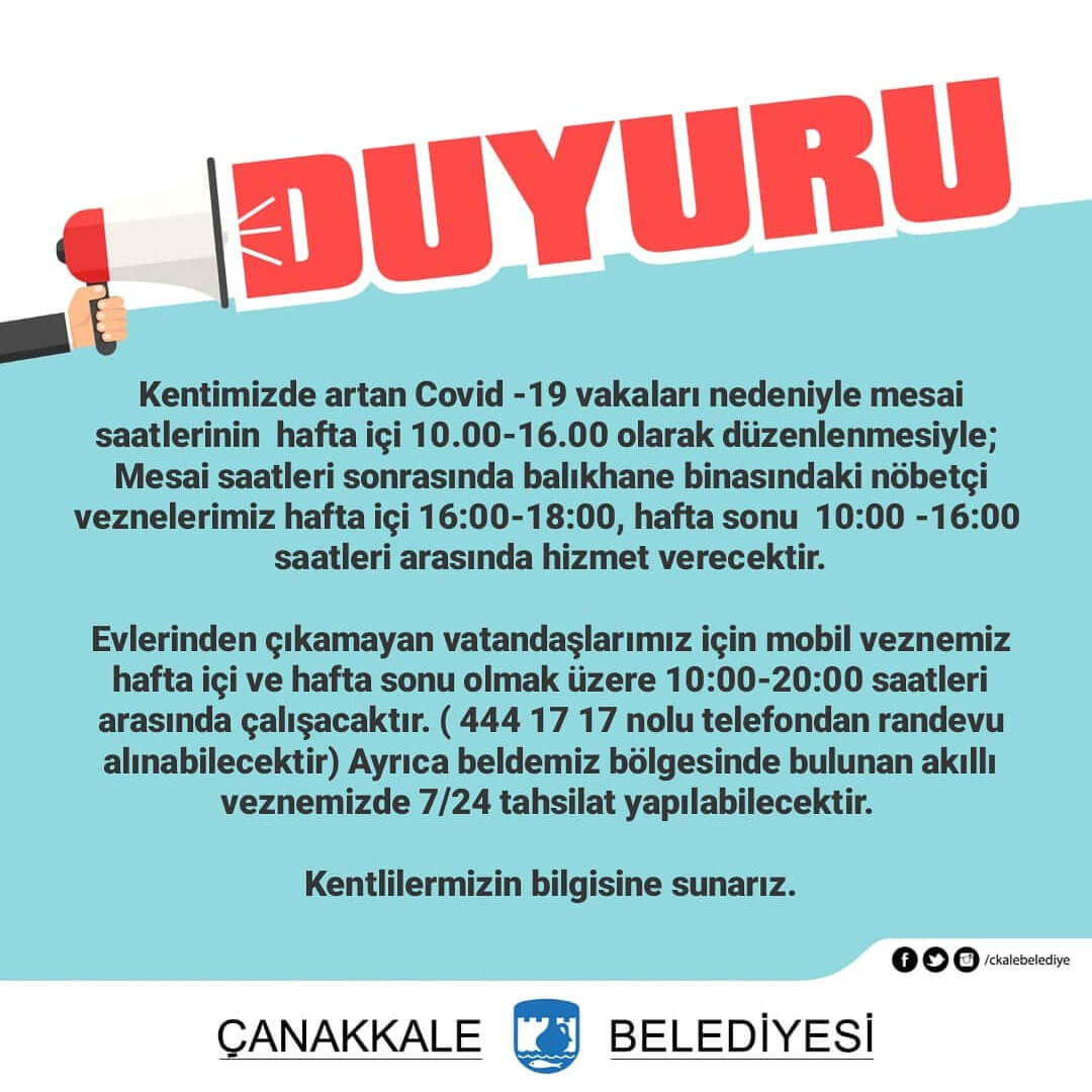 Kentimizde artan Covid-19 vakaları nedeniyle mesai saatlerinin hafta içi 10:00-16:00 olarak düzenlenmesiyle; mesai saatleri sonrasında Balıkhane binasındaki nöbetçi veznelerimiz hafta içi 16:00-18:00, hafta sonu 10:00-16:00 saatleri arasında hizmet verecektir.