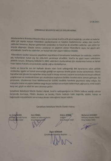 “Çanakkale Belediyesi Meclis Üyeleri olarak, İsrail'in saldırganlığının ve Filistin halkına yaptığı zulmün karşısında durmaya, Filistin davasını ve kardeş Filistin halkının haklı özgürlük, adalet, hukuk ve bağımsızlık mücadelesini savunmaya devam edeceğimizi beyan ederiz”.