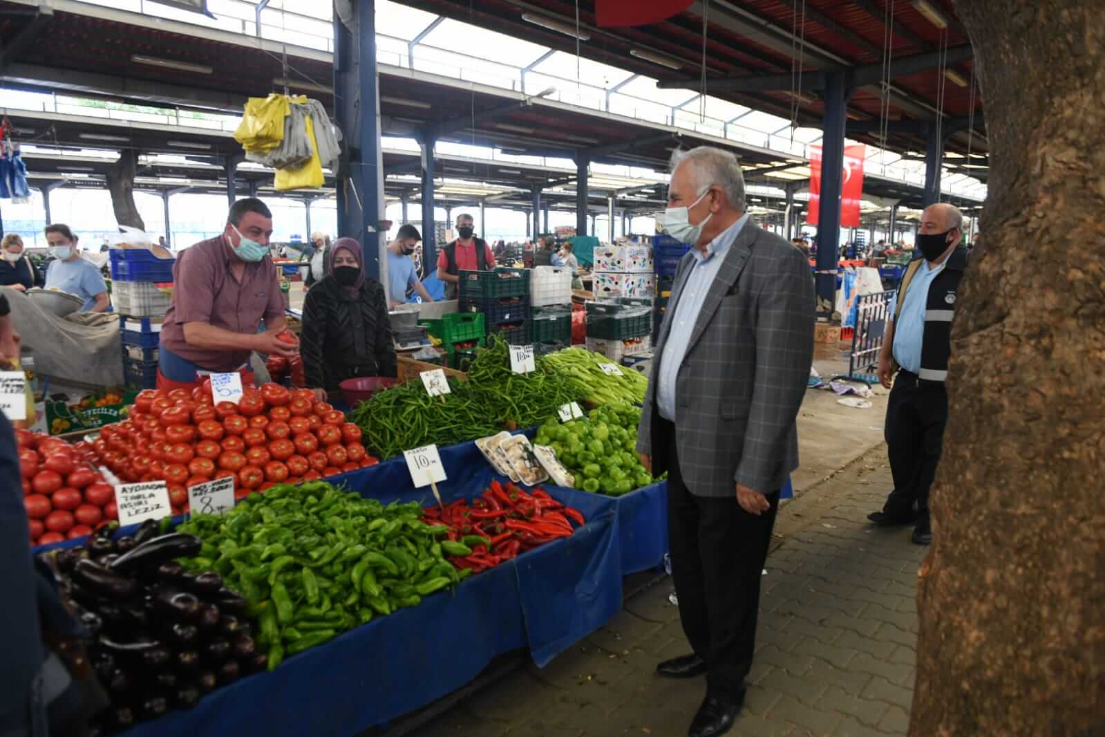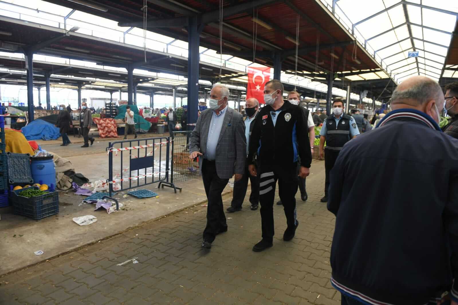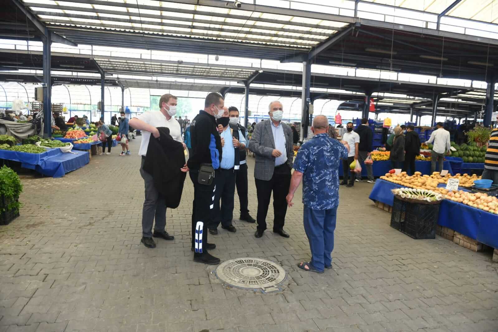 Başkan Gökhan, zabıta ekipleri eşliğinde Pazar alanını gezerek, Covid-19 salgını ile mücadele kapsamında alınan tedbirleri denetledi. Başkan Gökhan, tedbirlerin uygulanmasına ilişkin de bilgi aldı.