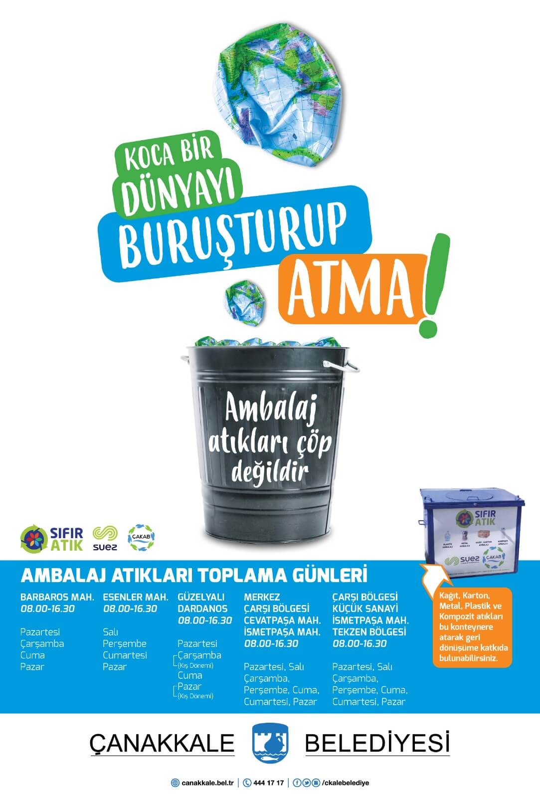 Kentlilerimiz de kağıt, karton, metal, plastik ve kompozit türü atıklarını kentteki geri dönüşüm kutularına atarak bu yöndeki çalışmalara katkı sağlayabilirler. Çevre ve doğayı korumak adına yürütülen çalışmalar kapsamında ambalaj atıkları kentimizin farklı noktalarından haftanın belirli gün ve saatlerinde toplanmakta olup, bu programa uyulması genel kirliliğin önüne geçilmesine de destek olacaktır.