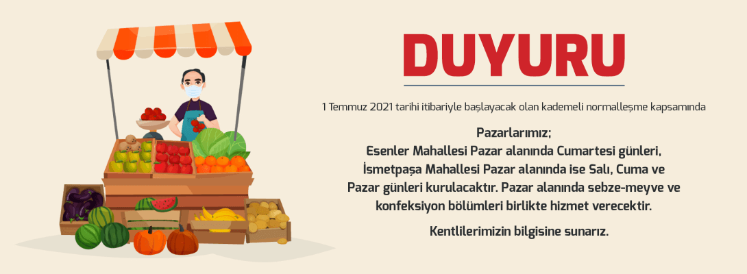 1 Temmuz 2021 tarihi itibariyle başlayacak olan kademeli normalleşme kapsamında Pazarlarımız; Esenler Mahallesi Pazar alanında Cumartesi günleri, İsmetpaşa Mahallesi Pazar alanında ise Salı, Cuma ve Pazar günleri kurulacaktır. Pazar alanında sebze-meyve ve konfeksiyon bölümleri birlikte hizmet verecektir.