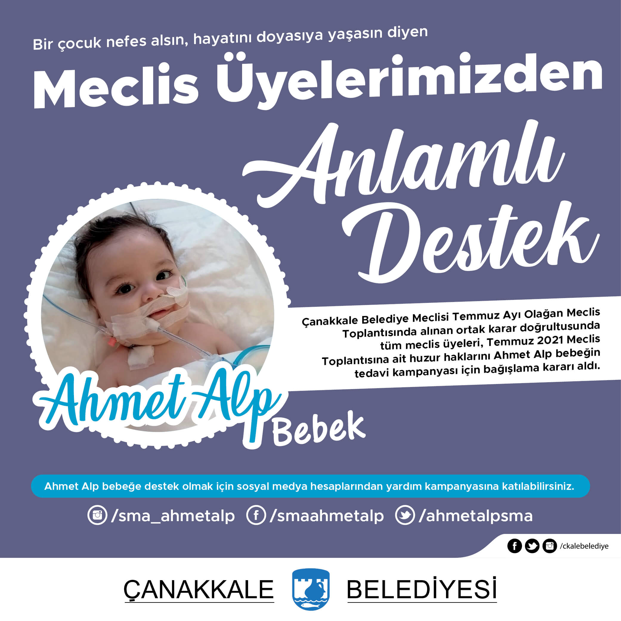 Çanakkale Belediyesinin ve Belediye Başkanı Ülgür Gökhan’ın da sık sık destek amaçlı paylaşımlarda bulunduğu Ahmet Alp bebek için Belediye Meclis Üyeleri de birlik oldu. 1 Temmuz 2021 Perşembe günü gerçekleşen Çanakkale Belediye Meclisi Temmuz Ayı Olağan Meclis Toplantısında alınan ortak karar doğrultusunda tüm meclis üyeleri, Temmuz 2021 Meclis Toplantısına ait huzur haklarını Ahmet Alp bebeğin tedavi kampanyası için bağışlama kararı aldı.