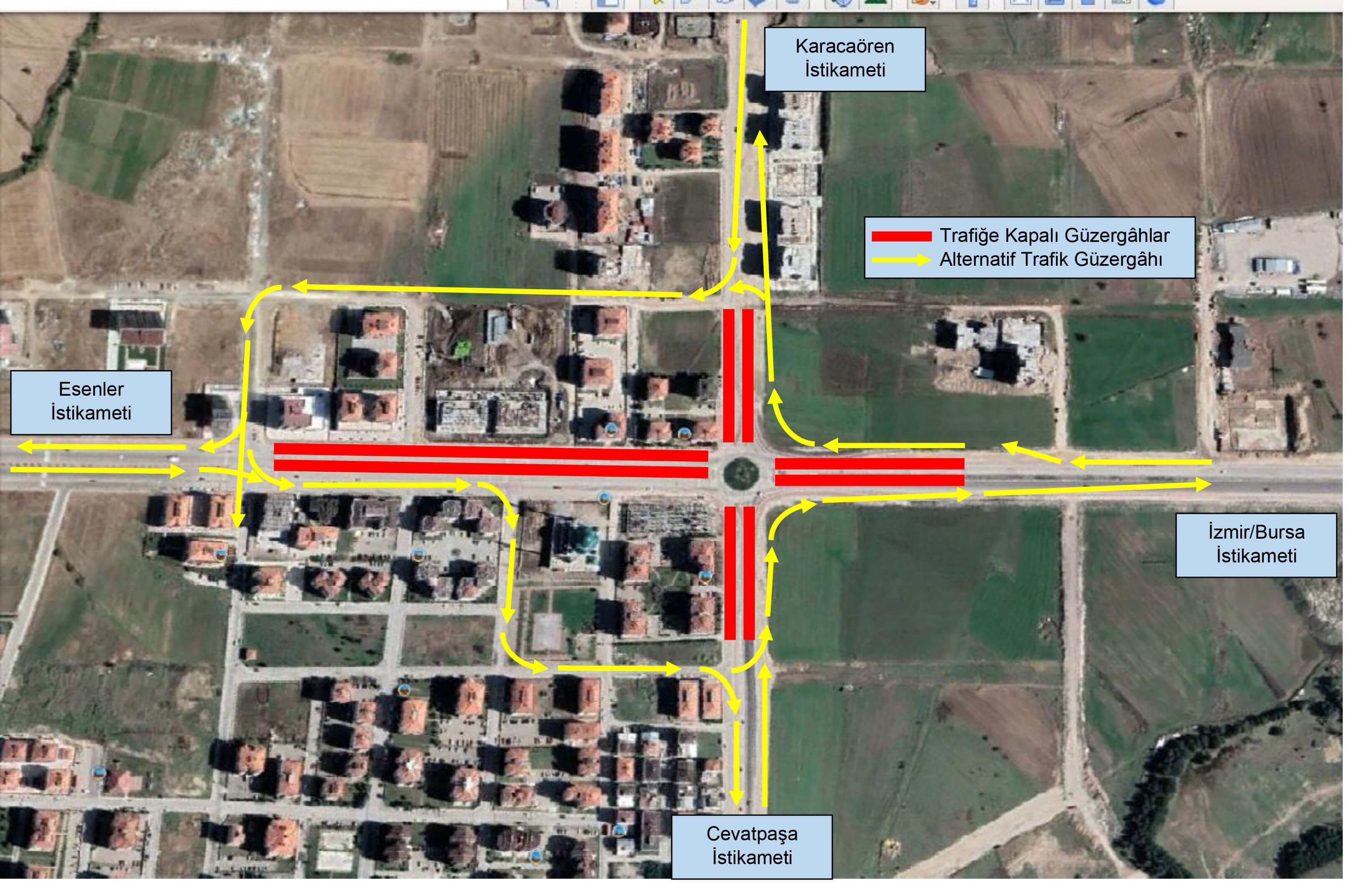 Çalışma yapılacak yol, belirtilen tarihlerde gün boyu yaya ve araç trafiğine kapatılacak olup, ekli krokide belirtilen alternatif güzergah üzerinden ulaşım sağlanacaktır.