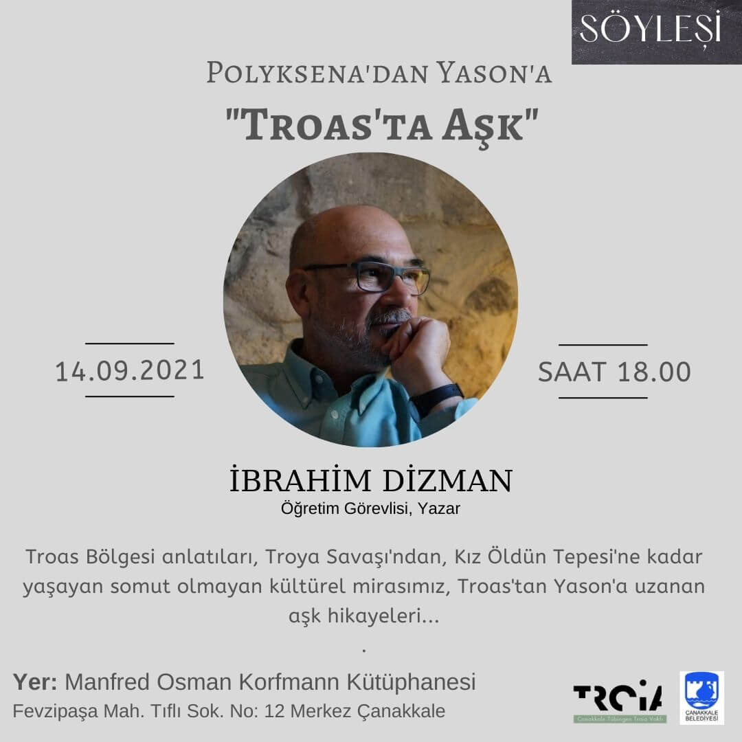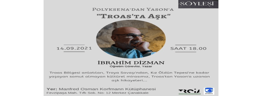 Polyksena'dan Yason'a "Troas'ta Aşk" söyleşisi ile yazar ve öğretim görevlisi İbrahim Dizman 14 Eylül 2021 Salı günü saat 18.00'de Manfred Osman Korfmann Kütüphanesinde sizlerle olacak.