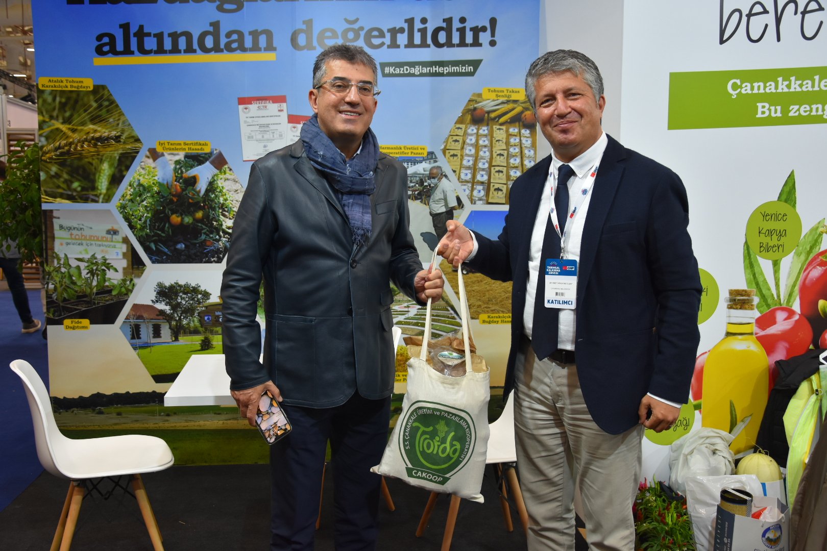 Günaydın’ı belediye standında ağırlayan Başkan Yardımcısı M. İrfan Mutluay, Çanakkale Belediyesi’nin Tohum Sandığı, Üretici Pazarı, Aromatik Bitki Parkı, Halkın Bakkalı projelerinin yanında ÇAKOP ve Troida Kadın Kooperatifi faaliyetleri ile yetiştirilen yerel ürünlere ilişkin bilgi verdi. Ziyaret nedeni ile Günaydın’a teşekkürlerini ileten Mutluay, Çanakkale’nin yerel ürünlerinden takdim etti.