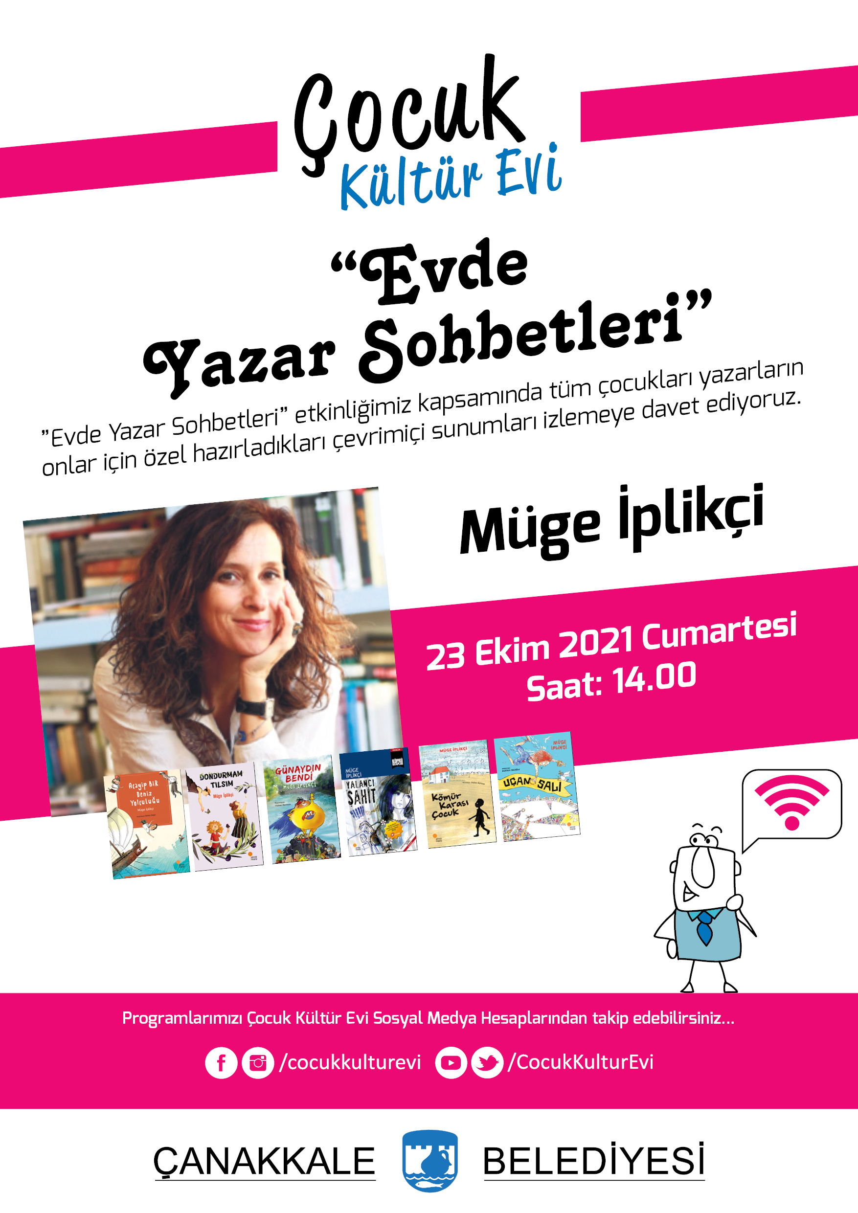 Pandemi öncesinde yüz yüze gerçekleştirilen “Yazar Buluşmaları” etkinliği ise pandemi tedbirleri kapsamında çevrim içi olarak “Evde Yazar Sohbetleri” başlığıyla Çocuk Kültür Evi sosyal medya hesapları üzerinden paylaşıma sunulmaya devam ediliyor. 23 Ekim 2021 tarihinde yazar Müge İplikçi’nin sohbeti ile başlayacak olan buluşmalar aracılığıyla çocuklara çocuk edebiyatının sevilen yazarlarını ve kitaplarını tanıma, yazma serüvenlerini öğrenme fırsatı yaratılıyor.