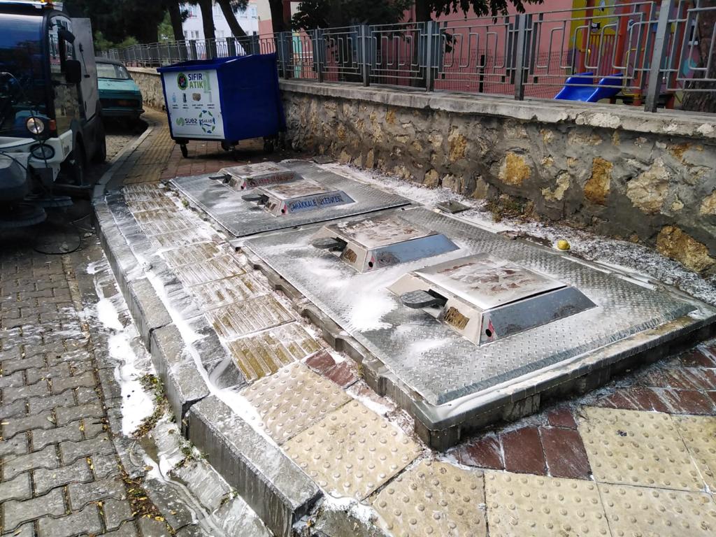 Temizlik İşleri Müdürlüğü ekipleri tarafından düzenlenen temizlik çalışması kapsamında, kent genelinde bulunan çöp konteynerleri temizlendi. Gelişi güzel atılan atıklar ve çeşitli nedenler ile kirlenen yer altı ve yer üstü çöp konteynerleri köpüklü sular ile yıkanarak temizlenirken, öte yandan dezenfekte de edildi.