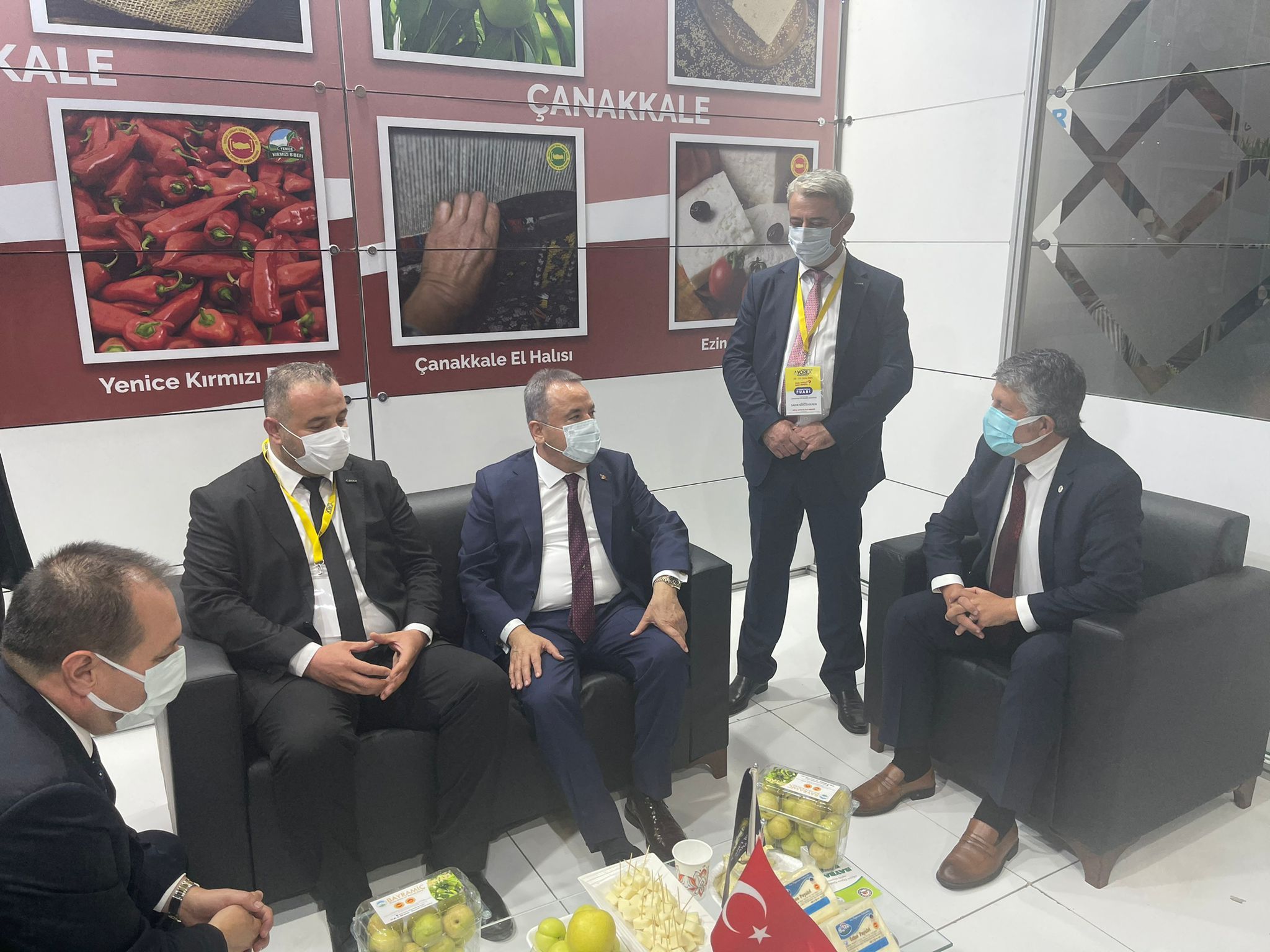 Çanakkale Belediyesi standını ziyaret eden Antalya Valisi Ersin Yazıcı, Antalya Büyükşehir Belediye Başkanı Muhittin Böcek ve TOBB Başkanı Rıfat Hisarcıklıoğlu'nu ağırlayan Belediye Başkan Yardımcısı M. İrfan Mutluay, Çanakkale Belediyesi'nin hayata geçirdiği yerel kalkınma yatırımları ve projelerin yanı sıra kooperatif çalışmaları hakkında konuklarına bilgi verirken, Çanakkale'nin yerel ürünlerinden de ikram etti.