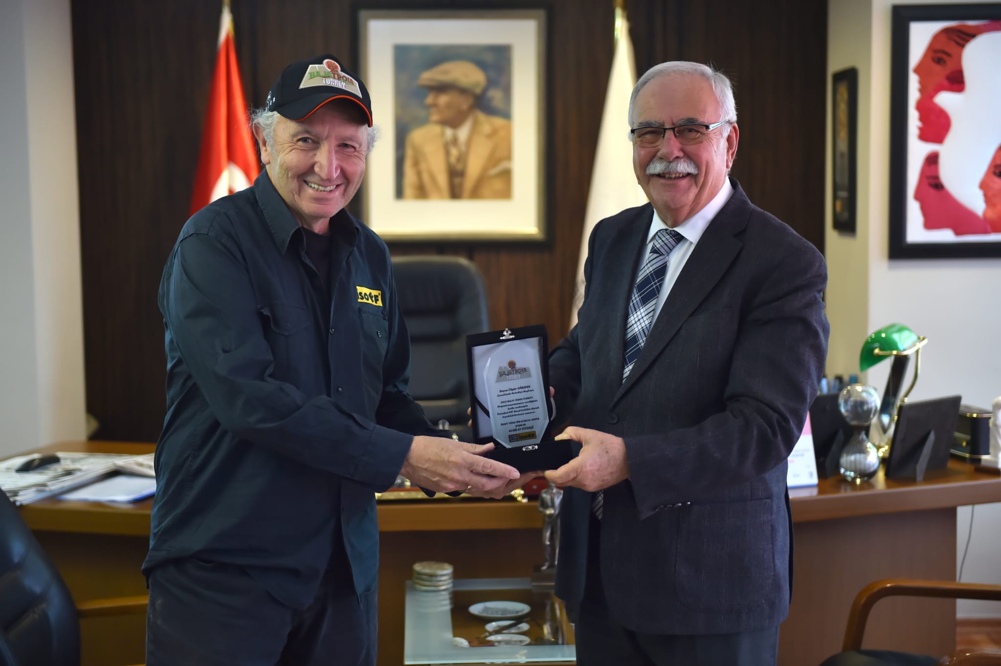 Başkan Gökhan’ı makamında ziyaret eden İstanbul Offroad Kulübü(İSOFF) temsilcisi Levent Uysal, Uluslararası East European Tout Terrain Series Türkiye ayağı olarak 5 yıldır düzenlenen Baja Troia’ya verdiği destekler ve ev sahipliği nedeni ile teşekkürlerini ileterek plaket takdiminde bulundu.