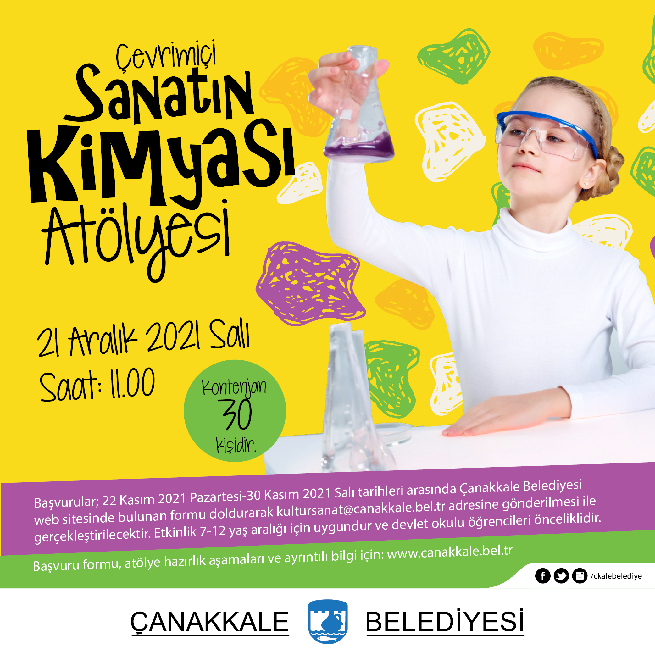 Çanakkale Belediyesi Aralık Ayı Kültür Etkinlikleri kapsamında, İstanbul Modern Sanat Müzesi iş birliği ile 21 Aralık 2021 Salı günü saat 11.00’de “Sanatın Kimyası Atölyesi” çevrimiçi ortamda gerçekleştirilecek.