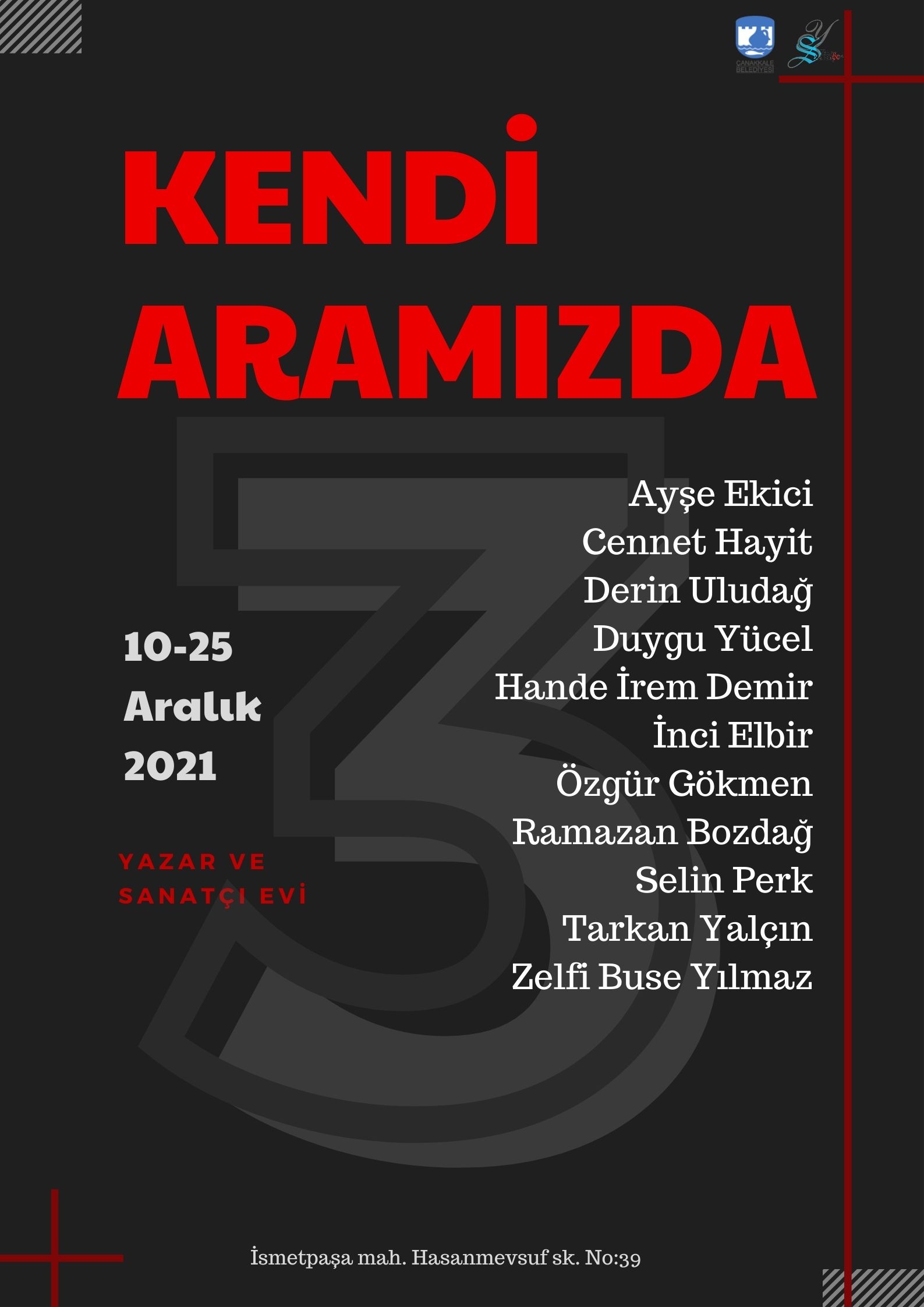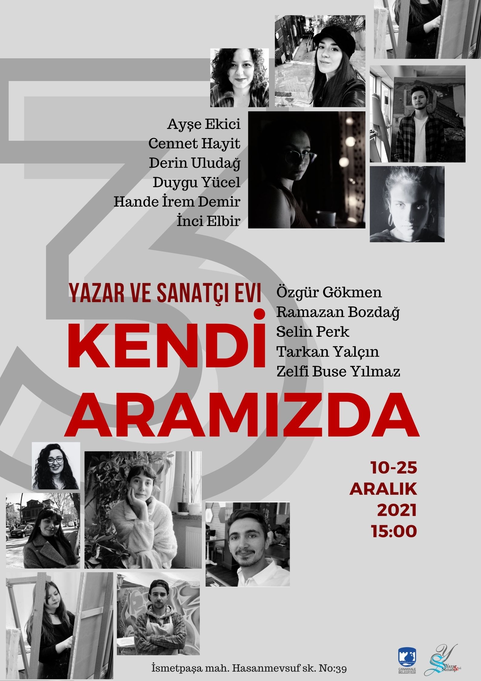Yazar ve Sanatçı Evi’nde gerçekleştirilen süreli sergiler kapsamında, 10-25 Aralık 2021 tarihleri arasında “Kendi Aramızda” isimli sergi sanatseverler ile buluşacak. Çanakkale Onsekiz Mart Üniversitesi Resim Ana Sanat Dalı'nda yüksek lisans ve sanatta yeterlik eğitimine devam eden öğrencilerden oluşan ''Kendi Aramızda'' isimli sanatçı grubunun 3. Sergisi Yazar ve Sanatçı Evi’nde ziyarete açık olacak.