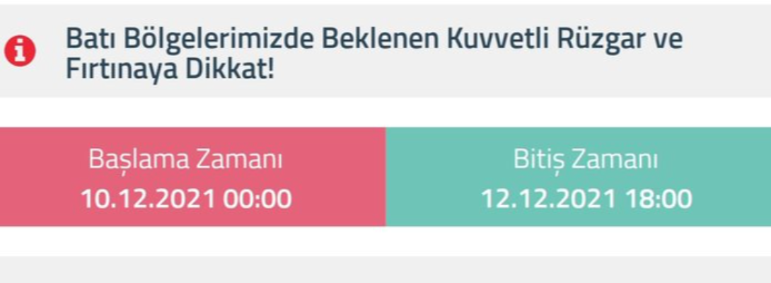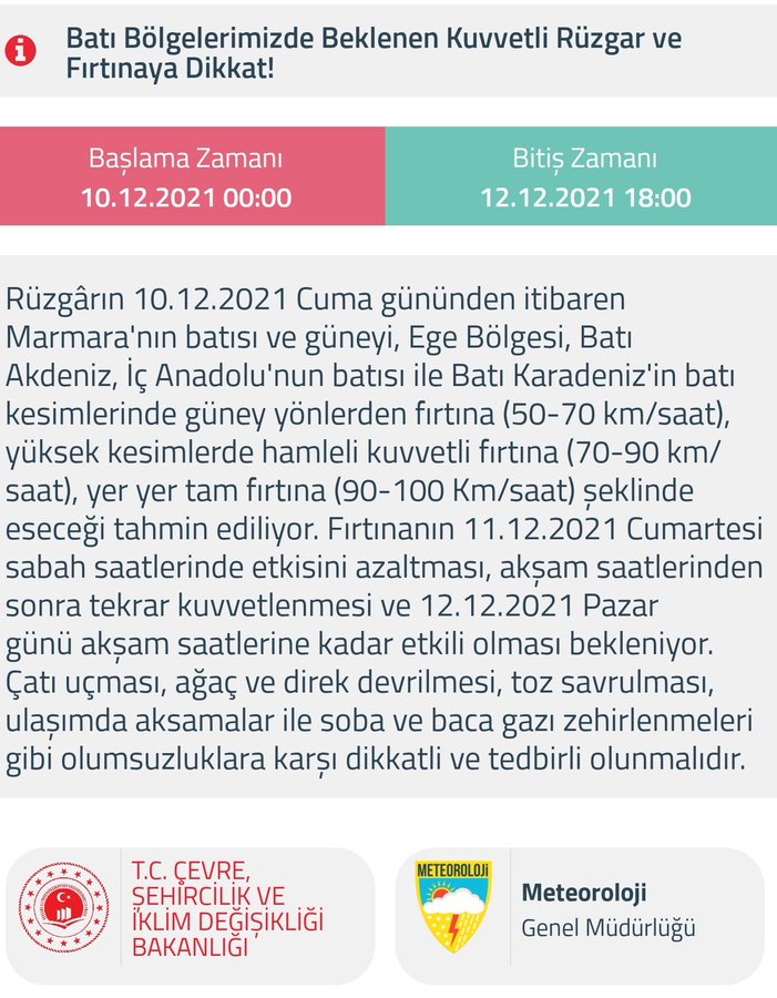 Rüzgarın 10.12 2021 Cuma gününden itibaren Marmara’nın batısı ve güneyi, Ege Bölgesi, Batı Akdeniz, İç Anadolu’nun batısı ile Batı Karadeniz’in batı kesimlerinde güney yönlerden fırtına (50-70 km/saat), yüksek kesimlerde hamleli kuvvetli fırtına (70-90 km/saat), yer yer am fırtına (90-100 km/saat) şeklinde eseceği tahmin ediliyor. Fırtınanın 11.12.2021 Cumartesi sabah erken saatlerde etkisini azaltması, akşam saatlerinden sonra tekrar kuvvetlenmesi ve 12.12.2021 Pazar günü akşam saatlerine kadar etkili olması bekleniyor. Çatı uçması, ağaç ve direk devrilmesi, toz savrulması, ulaşımda aksamalar ile soba ve baca gazı zehirlenmeleri gibi olumsuzluklara karşı tedbirli olunmalıdır.