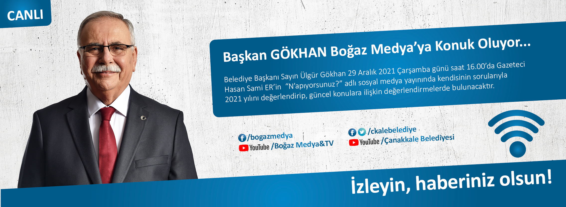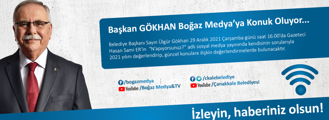 Belediye Başkanı Sayın Ülgür GÖKHAN, 29 Aralık 2021 Çarşamba günü (bugün) saat 16.00'da Boğaz Medya Sosyal Medya hesaplarına "Hasan Sami ER' ile N'apıyorsunuz" adlı programla canlı yayın konuğu olarak 2021 Yılı ve güncel konulara ilişkin değerlendirmelerde bulunacaktır. Yayını Çanakkale Belediyesi YouTube kanalından da canlı olarak izleyebilirsiniz.