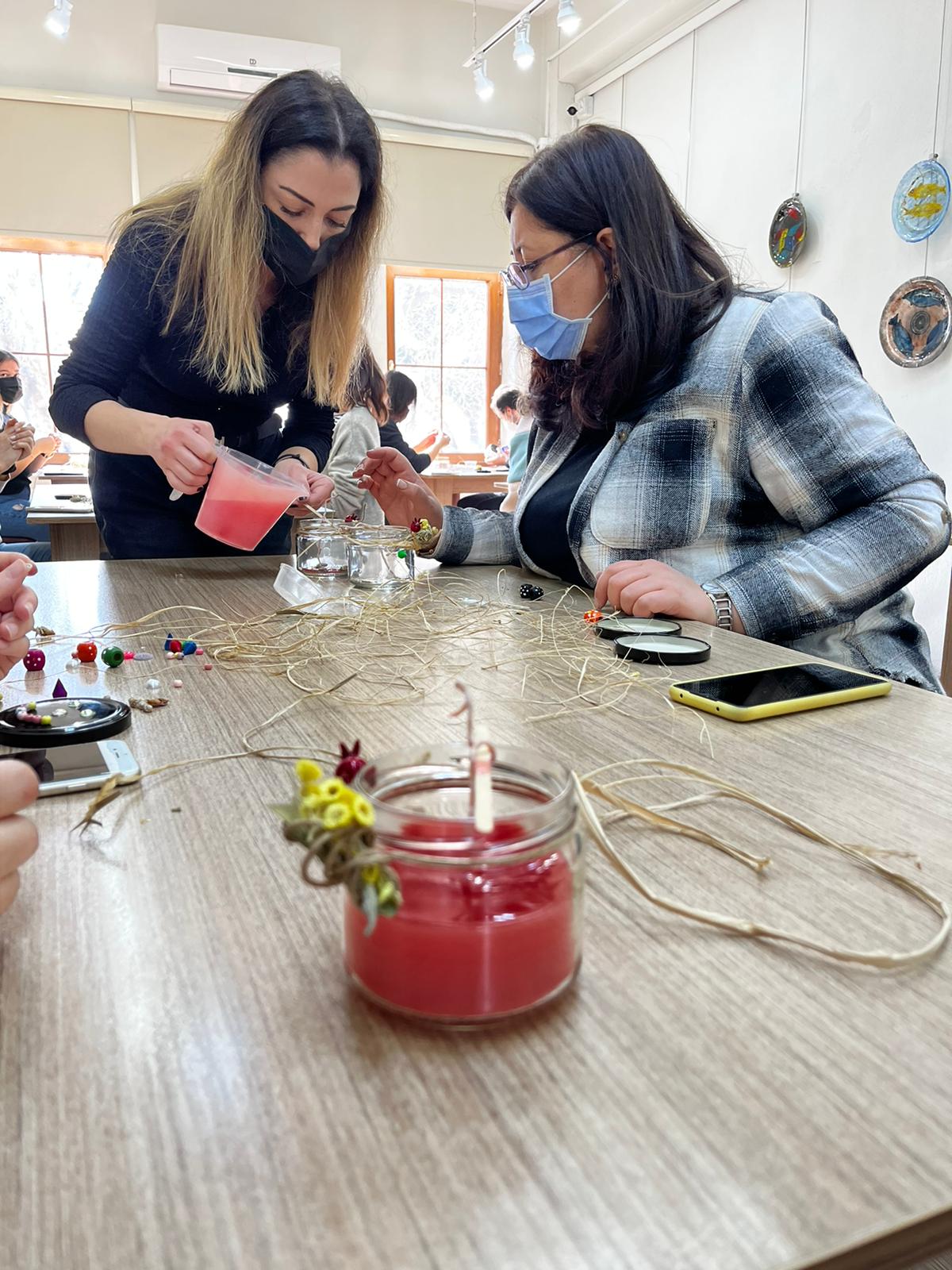 Katılımcılar, atölye başında mum yapımı ile ilgili bilgi alırken devam eden süreçte mum yapımını deneyimlediler. Keyifli geçen atölyenin sonunda, her katılımcı, atölyede yaptığı mumu alarak atölyeden ayrıldı.