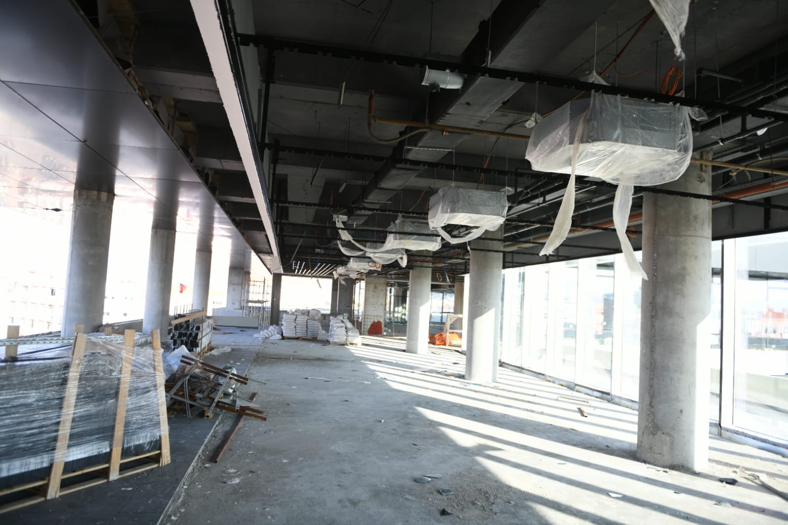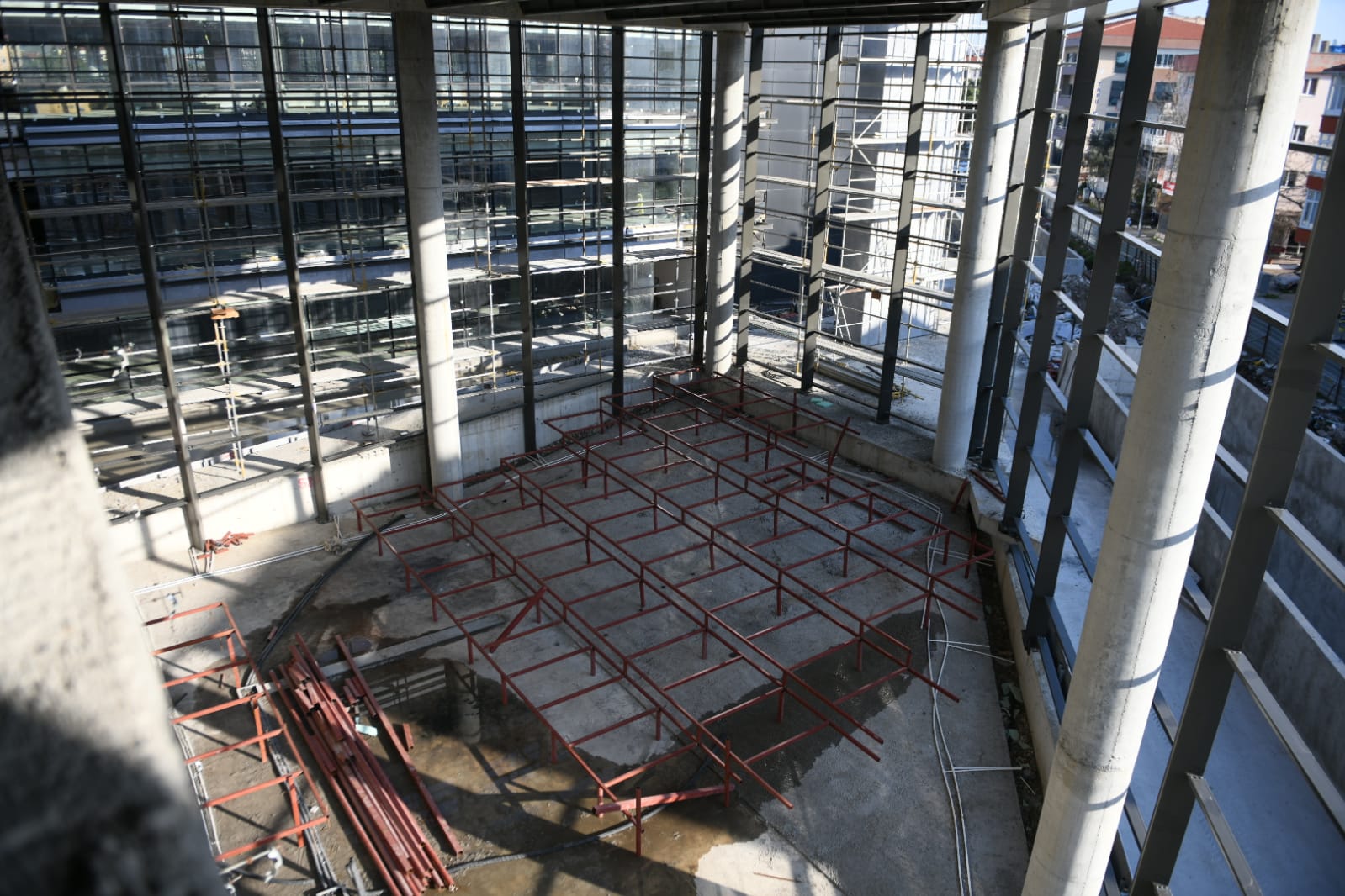 Bina içerisinde ise çok amaçlı salon, nikah salonu gibi mekanların tribün ve sahne taşıyıcı çelik imalatları tamamlanmış olup, meclis salonuna ait konstrüksiyon çalışmaları devam ediyor. Sahne mekanik sistemlerinin montajı %80 oranda tamamlandı. Akustik kaplamalar için hazırlık yapılmakta olup, konstrüksiyonların montajı yapılıyor. Islak hacimlerdeki duvar seramikleri ise tamamlanırken, zemin seramik kaplama işleri devam ediyor. İç mekanda mahalleri oluşturacak olan modüler bölme duvar sistemlerine ait taşıyıcı profillerin montajına başlandı. Duvar bölmelerine ait çalışmaların tüm katlarda 1-2 ay içerisinde tamamlanması planlanıyor.