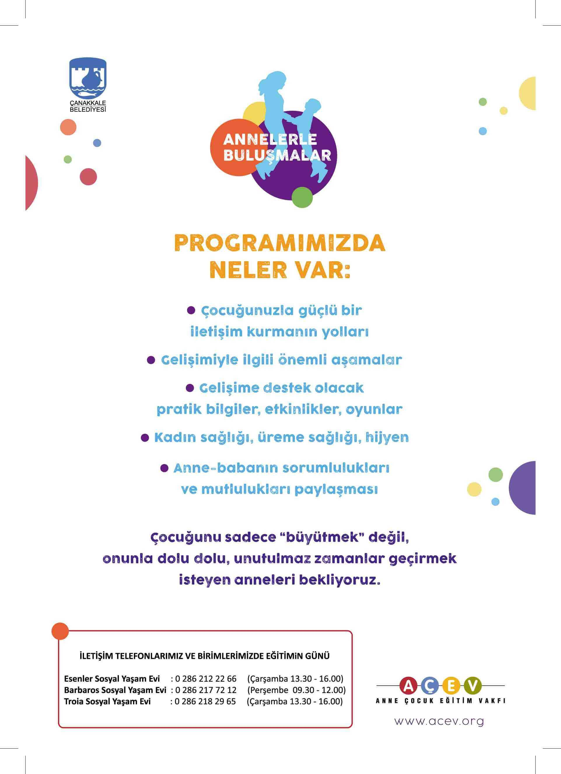 Sosyal Destek Hizmetleri Müdürlüğüne bağlı olarak her mahallede bulunan sosyal yaşam evlerimizde, Çanakkale Belediyesinde görevli sosyal hizmet uzmanı ve okul öncesi öğretmenler tarafından uygulanan grup eğitimlerinin materyalleri AÇEV desteğiyle sağlanmaktadır.