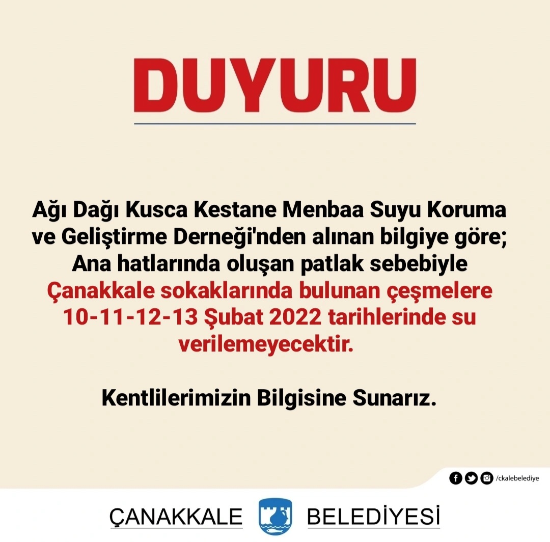 Ağı Dağı Kusca Kestane Menbaa Suyu Koruma ve Geliştirme Derneği’nden alınan bilgiye göre; ana hatlarında oluşan patlak sebebiyle Çanakkale sokaklarında bulunan çeşmelere 10-11-12-13 Şubat 2022 tarihlerinde su verilemeyecektir.