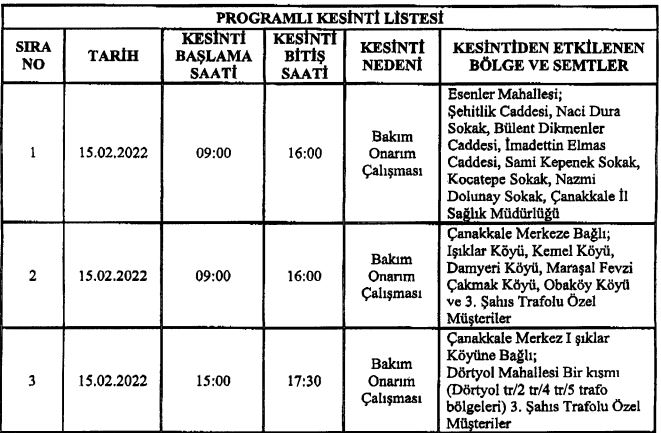Uludağ Elektrik Dağıtım A.Ş. Çanakkale İşletme Bakım Mühendisliğinden yapılan açıklamaya göre;