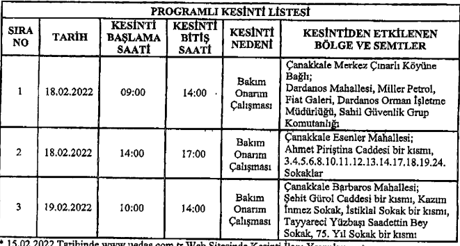 Uludağ Elektrik Dağıtım A.Ş. Çanakkale İşletme Bakım Mühendisliğinden yapılan açıklamaya göre;