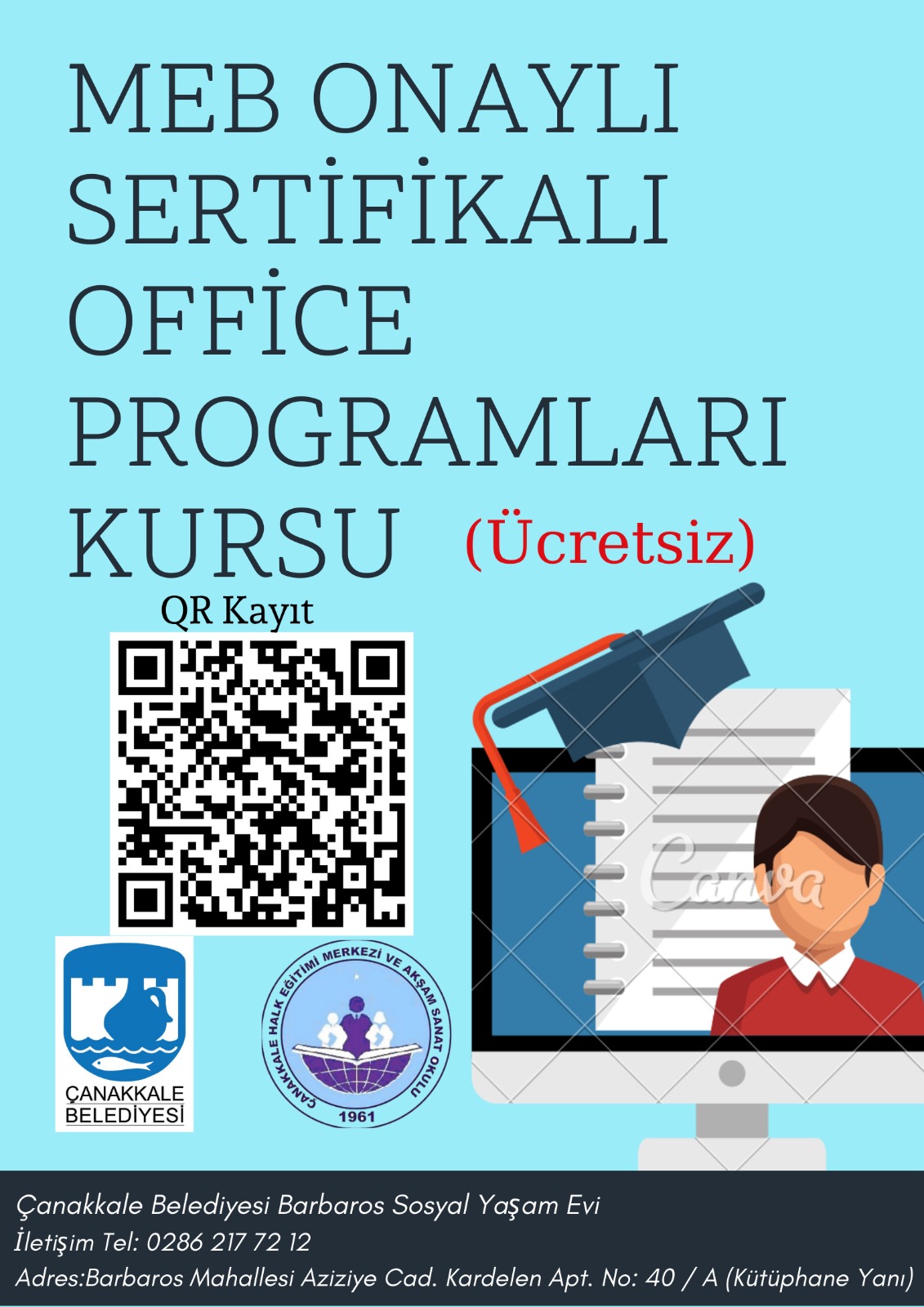 Çanakkale Belediyesi ile Halk Eğitim Merkezi Müdürlüğü ortaklığında gerçekleştirilen ”MEB Onaylı Sertifikalı Office Programları Kursu” ikinci dönem kayıtları başladı.
