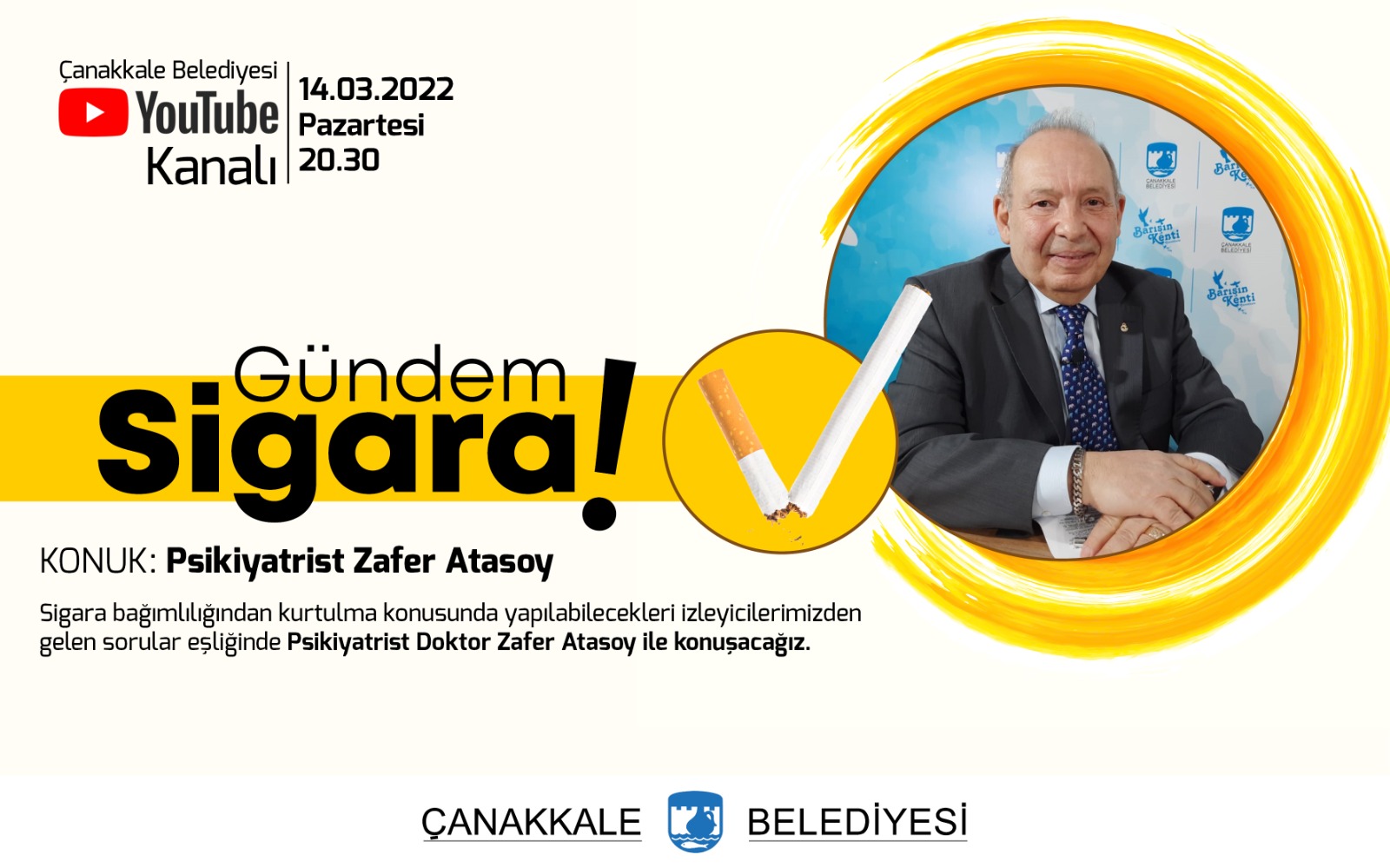 Çanakkale Belediyesi YouTube Kanalı’nda 14 Mart 2022 Pazartesi günü saat 20:30 yayınlanacak olan “Gündem Sigara” programının konuğu Psikiyatrist Zafer Atasoy oluyor.