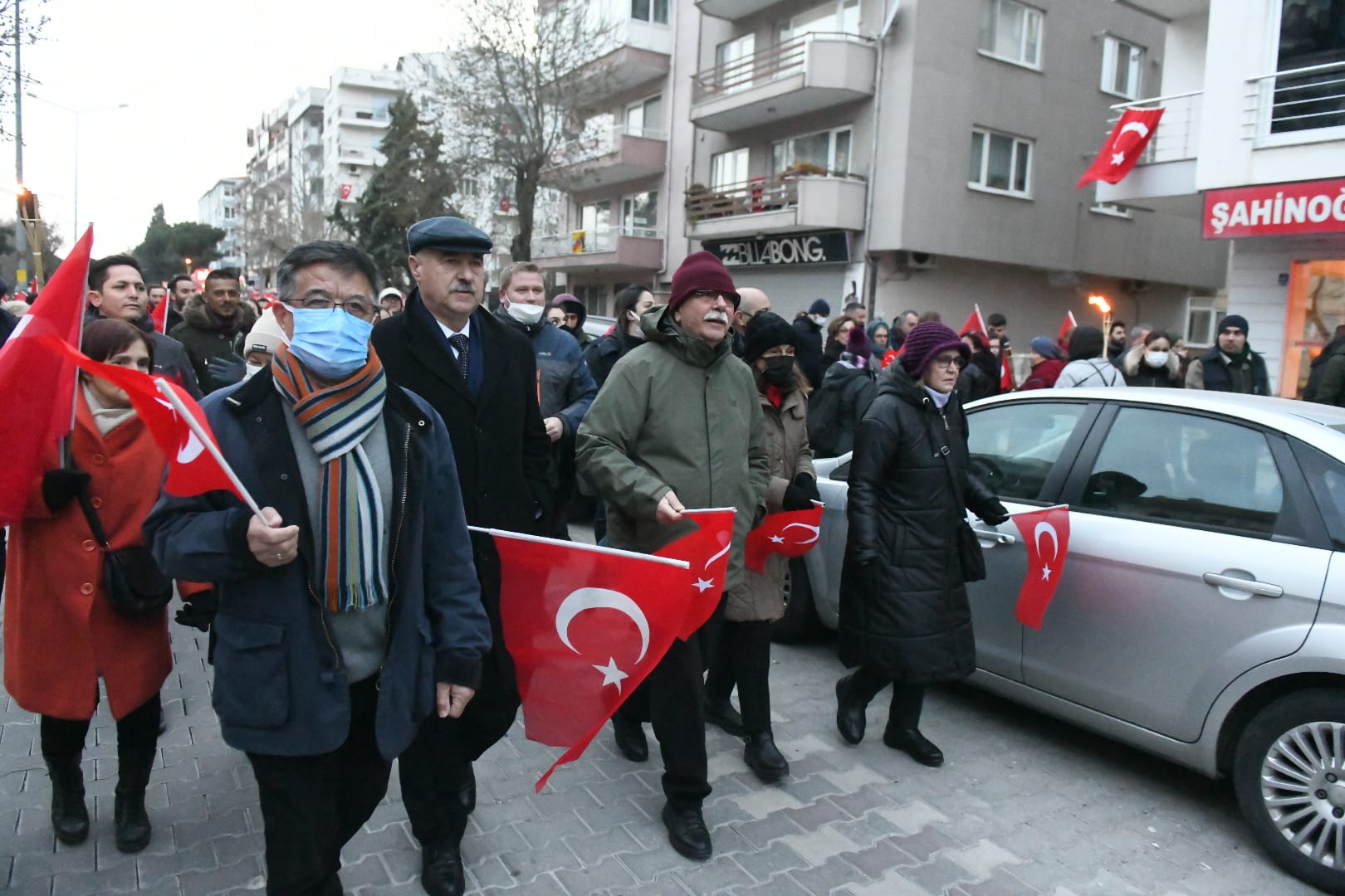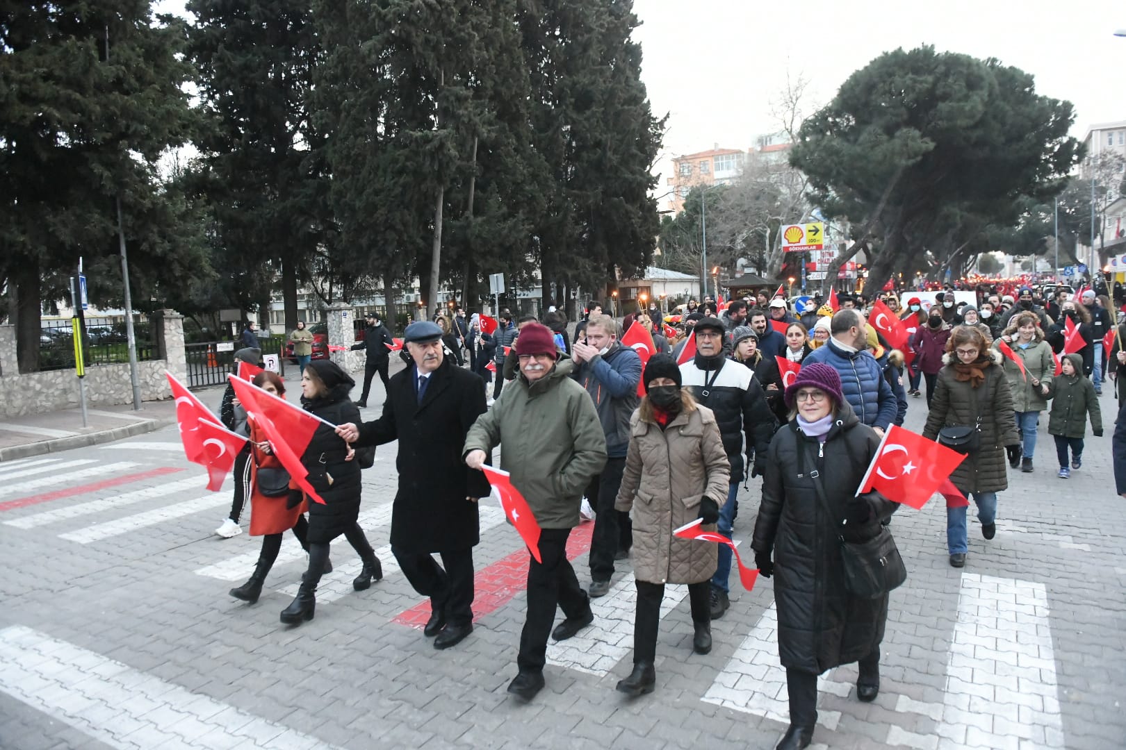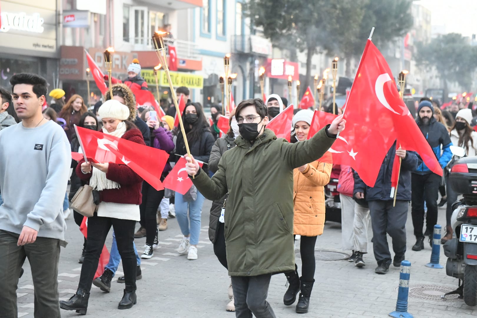 Belediye Başkanı Ülgür Gökhan’ın da Eşi Hale Gökhan ile birlikte katılım gösterdiği Fener Alayı için binlerce kentli saat 19:00’da Cumhuriyet Meydanı’nda bir araya geldi. Çok sayıda kentli ellerinde meşaleler, bayraklar ve pankartlarla 18 Mart Deniz Zaferi’nin coşkusunu birlikte marşlar söyleyerek yaşadı.