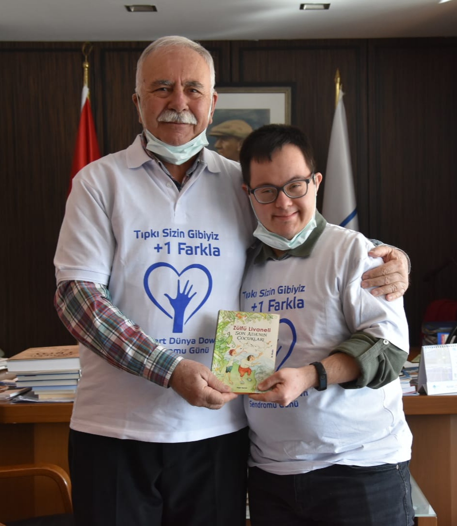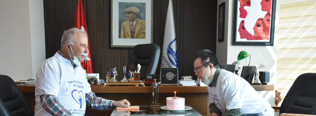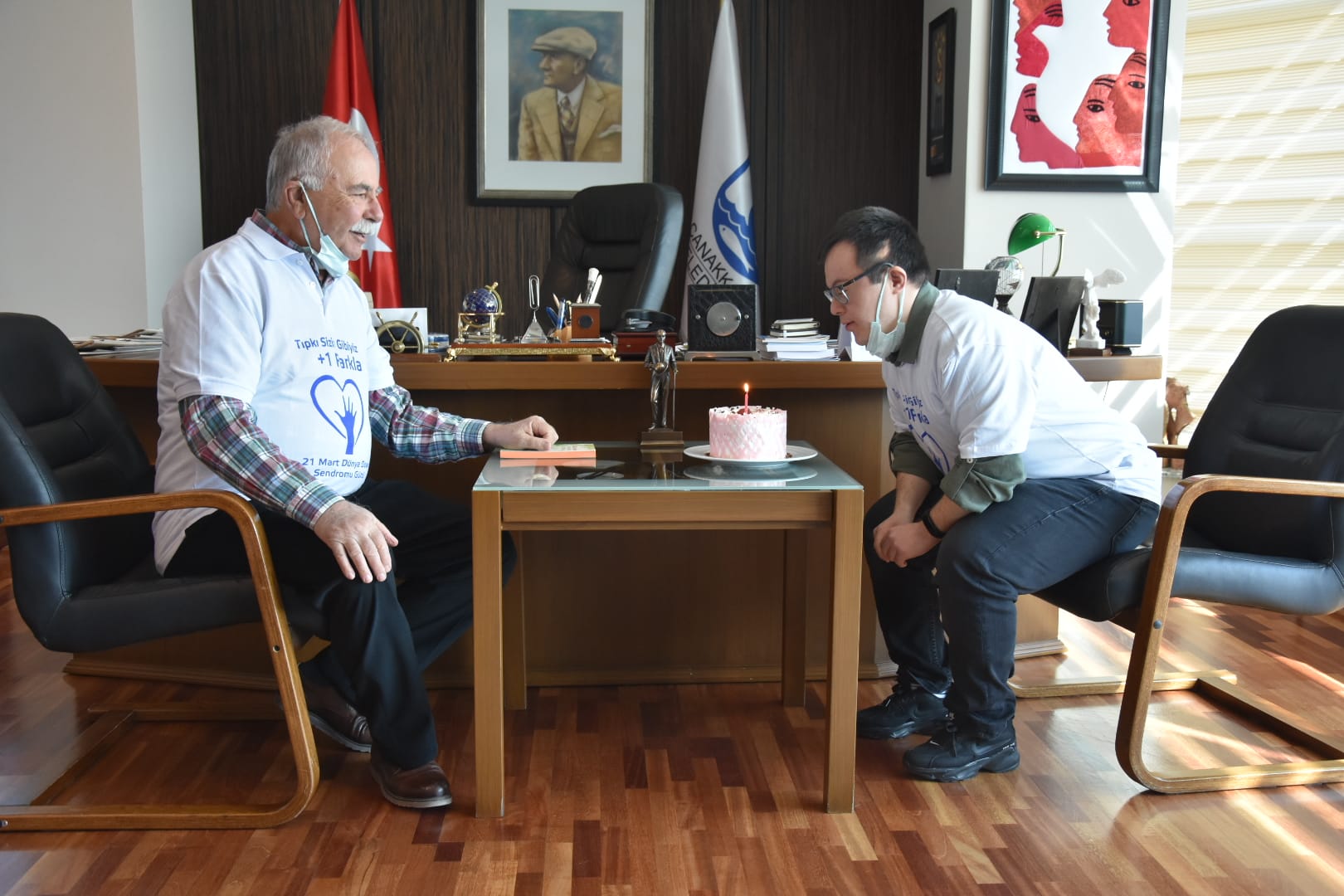 21 Mart Dünya Down Sendromu Farkındalık Günü kapsamında “Tıpkı Sizin Gibiyiz +1 Farkla” yazılı t-shirt giyen Başkan Ülgür Gökhan da belediyemizde yönetici asistanı olarak görev yapan Umut Başaran ile bir araya gelerek bu özel gün için pasta kesti.