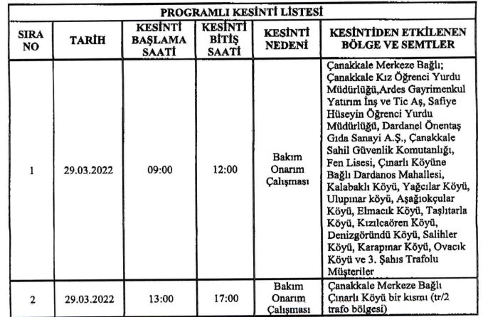Uludağ Elektrik Dağıtım A.Ş. Çanakkale İşletme Bakım Mühendisliğinden yapılan açıklamaya göre;