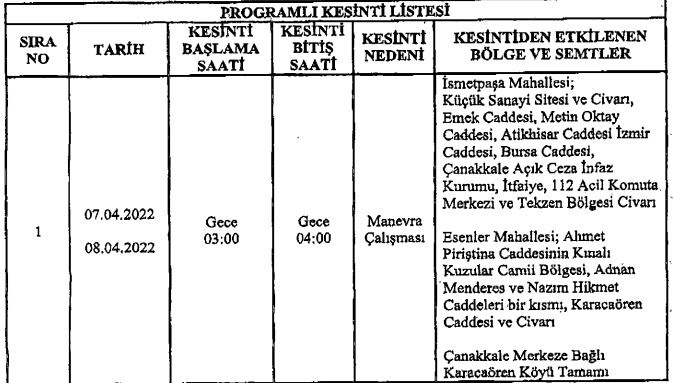 Uludağ Elektrik Dağıtım A.Ş. Çanakkale İşletme Bakım Mühendisliğinden yapılan açıklamaya göre;