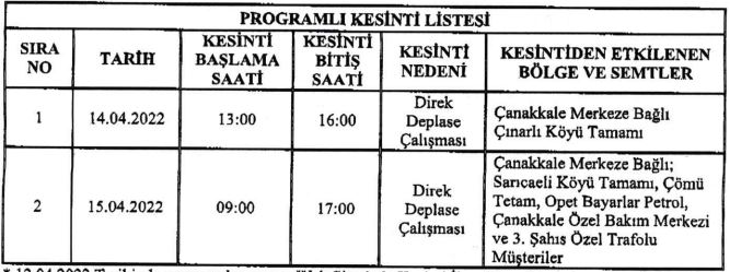 Uludağ Elektrik Dağıtım A.Ş. Çanakkale İşletme Bakım Mühendisliğinden yapılan açıklamaya göre;