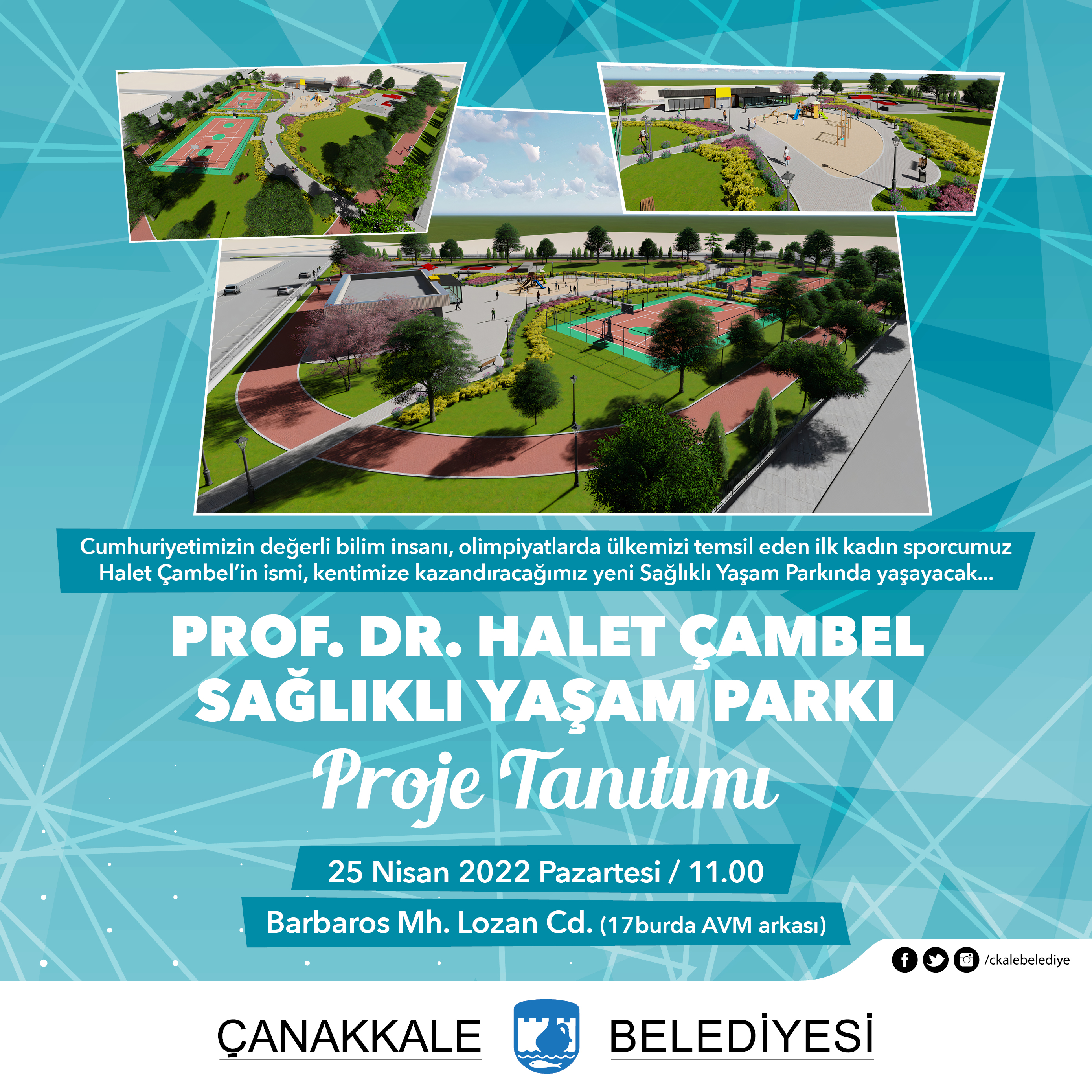 25 Nisan Pazartesi saat 11:00’de Barbaros Mahallesi Lozan Caddesi’nde (17burda AVM arkası) düzenlenecek olan Prof. Dr. Halet Çambel Sağlıklı Yaşam Parkı proje tanıtımına tüm kentlilerimiz davetlidir.
