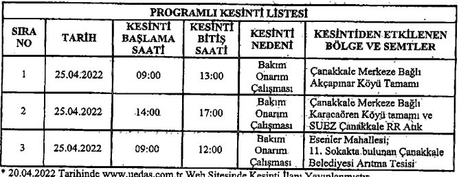 Uludağ Elektrik Dağıtım A.Ş. Çanakkale İşletme Bakım Mühendisliğinden yapılan açıklamaya göre;