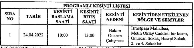 Enerji nakil hatlarında yapılacak olan bakım onarım çalışması kapsamında görselde belirtilen tarih ve belirtilen yerlerde elektrik kesintisi uygulanacaktır.
